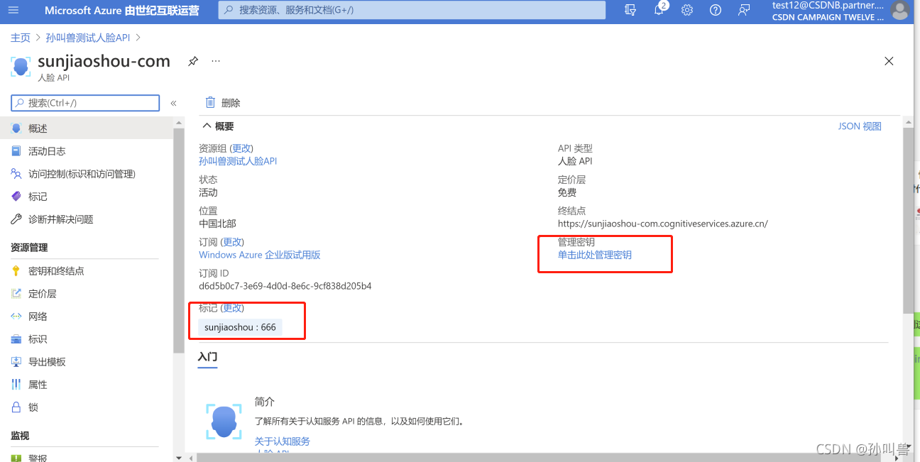 这里可以对标记进行编辑(增加名称及值即可:用于管理不同的资源组,标记是名称/值对,可便于将相同的标记应用于多个资源和资源组,从而对资源进行分类,并查看合并的帐单。标记名称不区分大小写,但标记值区分大小写。),也可以管理密钥,密钥一般有两个(密钥用于访问认知服务 API。请勿共享你的密钥。请安全地存储这些密钥(例如,使用 Azure Key Vault)。另外,建议定期重新生成这些密钥。执行 API 调用只需要一个密钥。在重新生成第一个密钥时,可以使用第二个密钥继续访问服务。)