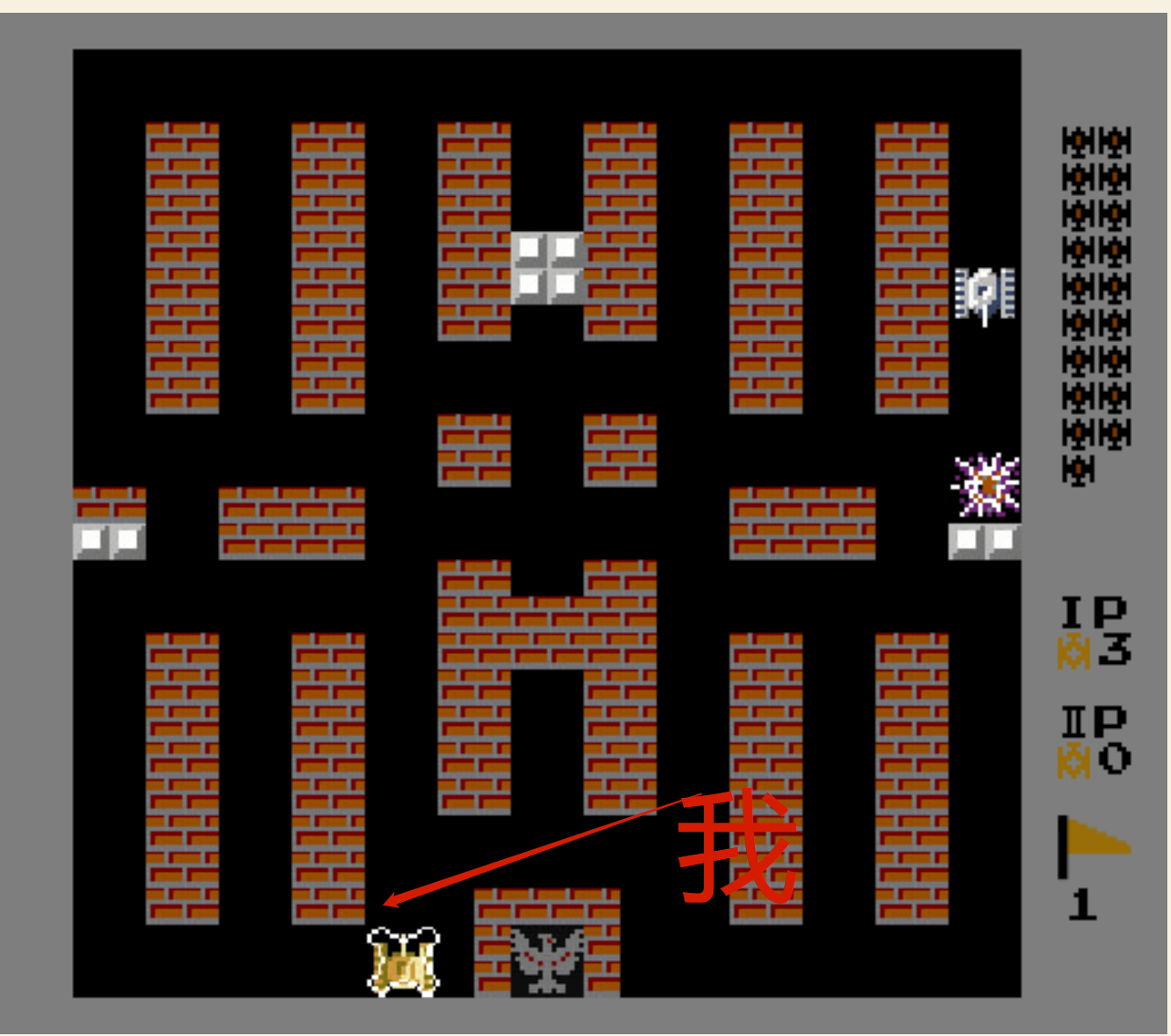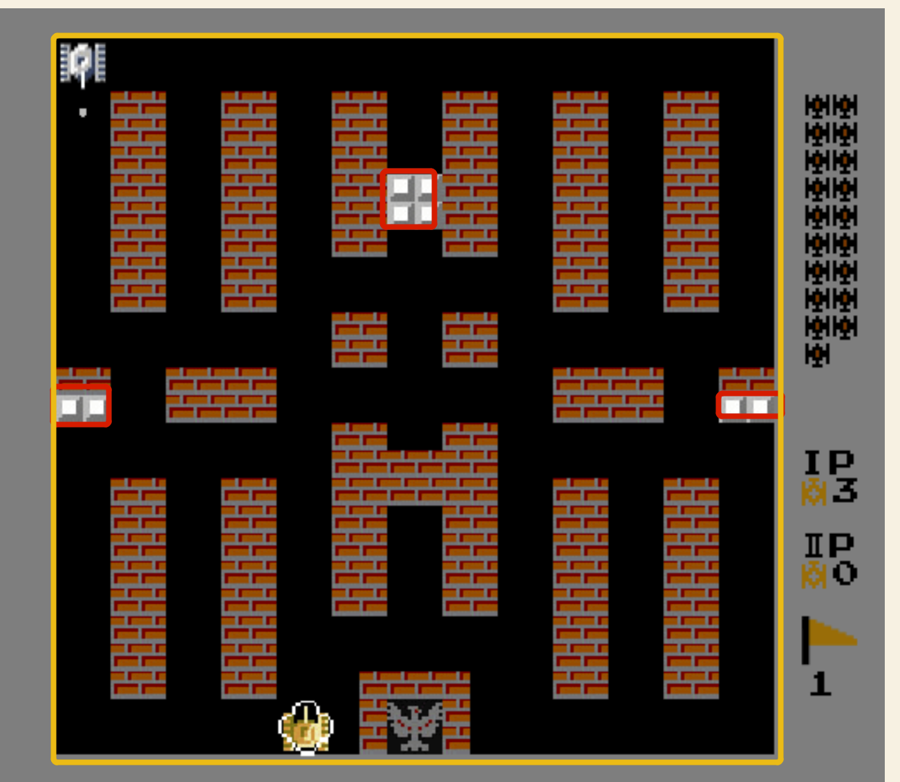 比如图中红色标记的砖头是打不破的,只能绕道走,还有只能再yellow标记的区域内操作,其它砖头用子弹就可以打破,不能让对手先打破你的大本营(我右边中间的老鹰),不然又得GG.