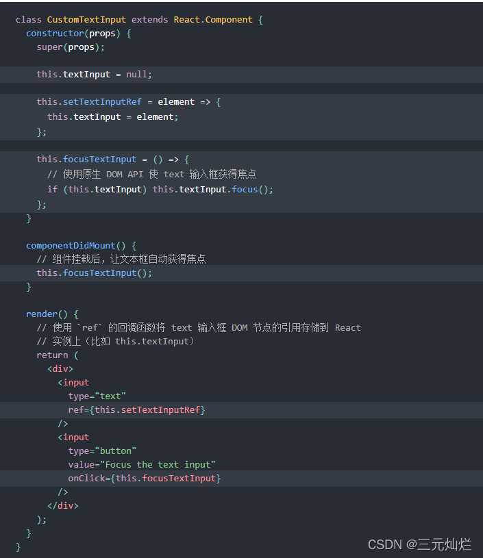 }class Parent extends React.Component {render() {return (<CustomTextInputinputRef={el => this.inputElement = el}/>);}