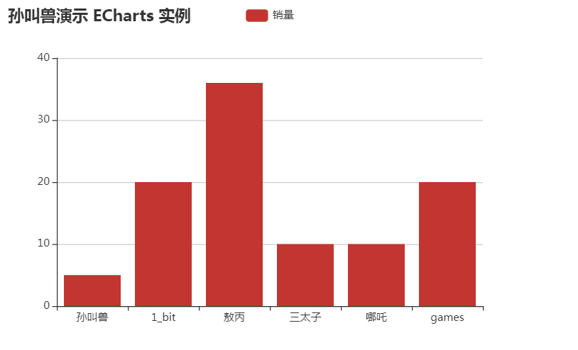 <body><!-- 为ECharts准备一个具备大小(宽高)的Dom --><div id="main" style="width: 600px;height:400px;"></div><script type="text/javascript">// 基于准备好的dom,初始化echarts实例var myChart = echarts.init(document.getElementById('main'));// 指定图表的配置项和数据var option = {title: {text: '孙叫兽演示 ECharts 实例'},tooltip: {},legend: {data:['销量']},xAxis: {data: ["孙叫兽","1_bit","敖丙","三太子","哪吒","games"]},yAxis: {},series: [{name: '销量',type: 'bar',data: [5, 20, 36, 10, 10, 20]}]};// 使用刚指定的配置项和数据显示图表。myChart.setOption(option);</script>