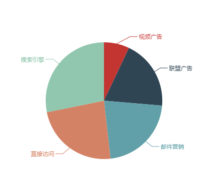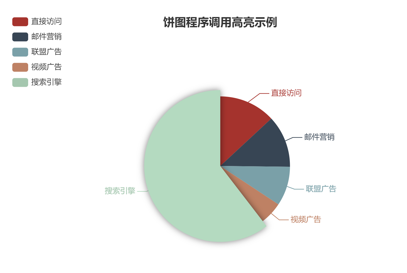 <body><!-- 为ECharts准备一个具备大小(宽高)的Dom --><div id="main" style="height: 100%;min-height:400px;"></div><script type="text/javascript">// 基于准备好的dom,初始化ECharts实例var myChart = echarts.init(document.getElementById('main'));var app = {};option = null;// 指定图表的配置项和数据var option = {title : {text: '饼图程序调用高亮示例',x: 'center'},tooltip: {trigger: 'item',formatter: "{a} <br/>{b} : {c} ({d}%)"},legend: {orient: 'vertical',left: 'left',data: ['直接访问','邮件营销','联盟广告','视频广告','搜索引擎']},series : [{name: '访问来源',type: 'pie',radius : '55%',center: ['50%', '60%'],data:[{value:335, name:'直接访问'},{value:310, name:'邮件营销'},{value:234, name:'联盟广告'},{value:135, name:'视频广告'},{value:1548, name:'搜索引擎'}],itemStyle: {emphasis: {shadowBlur: 10,shadowOffsetX: 0,shadowColor: 'rgba(0, 0, 0, 0.5)'}}}]};app.currentIndex = -1;setInterval(function () {var dataLen = option.series[0].data.length;// 取消之前高亮的图形myChart.dispatchAction({type: 'downplay',seriesIndex: 0,dataIndex: app.currentIndex});app.currentIndex = (app.currentIndex + 1) % dataLen;// 高亮当前图形myChart.dispatchAction({type: 'highlight',seriesIndex: 0,dataIndex: app.currentIndex});// 显示 tooltipmyChart.dispatchAction({type: 'showTip',seriesIndex: 0,dataIndex: app.currentIndex});}, 1000);if (option && typeof option === "object") {myChart.setOption(option, true);}</script>