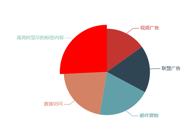 上面提到的"高亮",对于鼠标所在的扇形块,会使用 emphasis 样式;对于其他相关扇形块,则会使用 highlight 样式。通过这种方式,可以很方便地实现突出显示相关数据的需求。