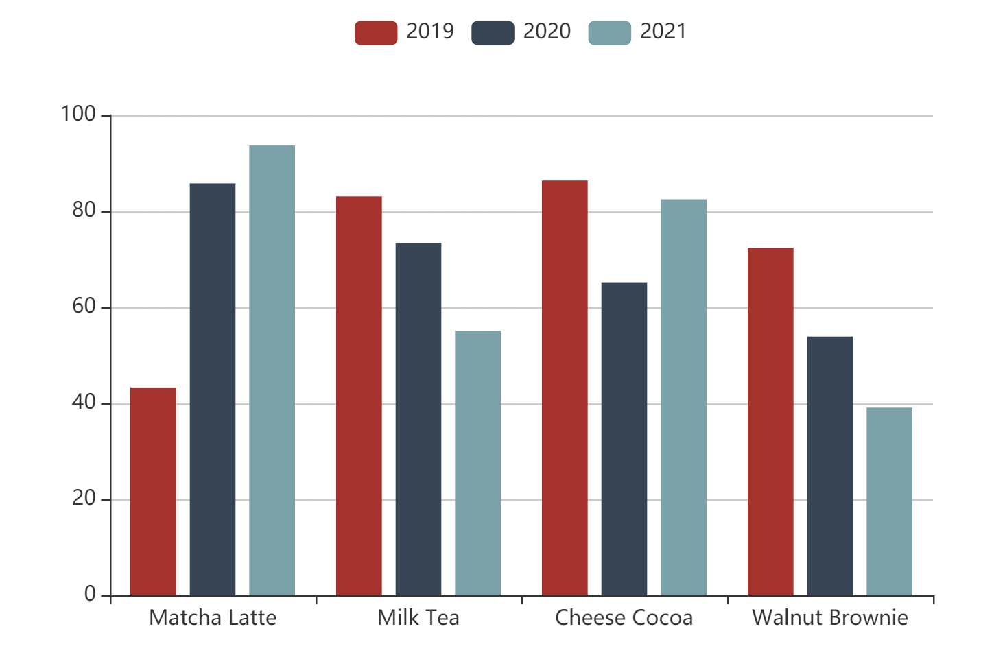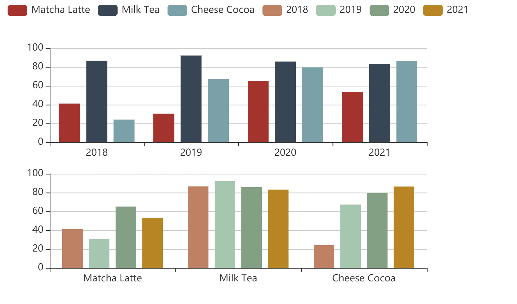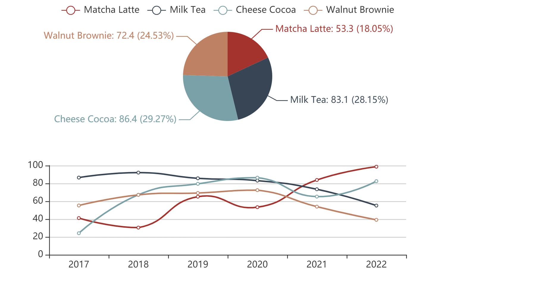 series: [{name: '销量', // 系列名称type: 'bar', // 系列图表类型data: [5, 20, 36, 10, 10, 20] // 系列中的数据内容