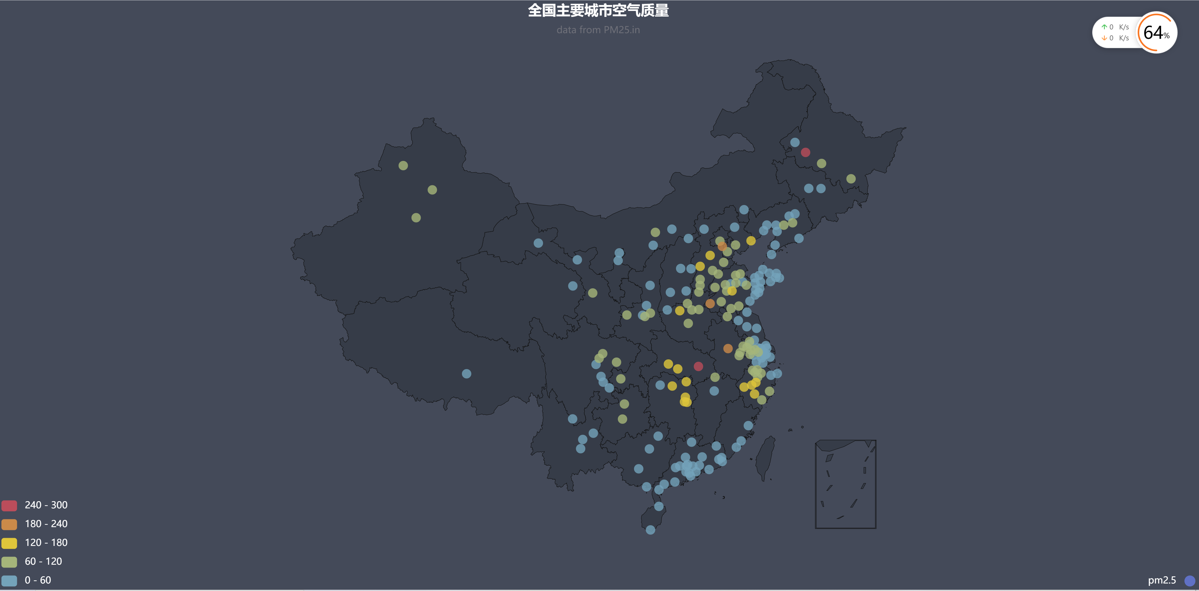 };option = {backgroundColor: '#404a59',title: {text: '全国主要城市空气质量',subtext: 'data from PM25.in',sublink: 'http://www.pm25.in',left: 'center',textStyle: {color: '#fff'}},tooltip: {trigger: 'item'},legend: {orient: 'vertical',top: 'bottom',left: 'right',data:['pm2.5'],textStyle: {color: '#fff'}},visualMap: {min: 0,max: 300,splitNumber: 5,color: ['#d94e5d','#eac736','#50a3ba'],textStyle: {color: '#fff'}},geo: {map: 'china',label: {emphasis: {show: false}},itemStyle: {normal: {areaColor: '#323c48',borderColor: '#111'},emphasis: {areaColor: '#2a333d'}}},series: [{name: 'pm2.5',type: 'scatter',coordinateSystem: 'geo',data: convertData([{name: "海门", value: 9},{name: "鄂尔多斯", value: 12},{name: "招远", value: 12},{name: "舟山", value: 12},{name: "齐齐哈尔", value: 14},{name: "盐城", value: 15},{name: "赤峰", value: 16},{name: "青岛", value: 18},{name: "乳山", value: 18},{name: "金昌", value: 19},{name: "泉州", value: 21},{name: "莱西", value: 21},{name: "日照", value: 21},{name: "胶南", value: 22},{name: "南通", value: 23},{name: "拉萨", value: 24},{name: "云浮", value: 24},{name: "梅州", value: 25},{name: "文登", value: 25},{name: "上海", value: 25},{name: "攀枝花", value: 25},{name: "威海", value: 25},{name: "承德", value: 25},{name: "厦门", value: 26},{name: "汕尾", value: 26},{name: "潮州", value: 26},{name: "丹东", value: 27},{name: "太仓", value: 27},{name: "曲靖", value: 27},{name: "烟台", value: 28},{name: "福州", value: 29},{name: "瓦房店", value: 30},{name: "即墨", value: 30},{name: "抚顺", value: 31},{name: "玉溪", value: 31},{name: "张家口", value: 31},{name: "阳泉", value: 31},{name: "莱州", value: 32},{name: "湖州", value: 32},{name: "汕头", value: 32},{name: "昆山", value: 33},{name: "宁波", value: 33},{name: "湛江", value: 33},{name: "揭阳", value: 34},{name: "荣成", value: 34},{name: "连云港", value: 35},{name: "葫芦岛", value: 35},{name: "常熟", value: 36},{name: "东莞", value: 36},{name: "河源", value: 36},{name: "淮安", value: 36},{name: "泰州", value: 36},{name: "南宁", value: 37},{name: "营口", value: 37},{name: "惠州", value: 37},{name: "江阴", value: 37},{name: "蓬莱", value: 37},{name: "韶关", value: 38},{name: "嘉峪关", value: 38},{name: "广州", value: 38},{name: "延安", value: 38},{name: "太原", value: 39},{name: "清远", value: 39},{name: "中山", value: 39},{name: "昆明", value: 39},{name: "寿光", value: 40},{name: "盘锦", value: 40},{name: "长治", value: 41},{name: "深圳", value: 41},{name: "珠海", value: 42},{name: "宿迁", value: 43},{name: "咸阳", value: 43},{name: "铜川", value: 44},{name: "平度", value: 44},{name: "佛山", value: 44},{name: "海口", value: 44},{name: "江门", value: 45},{name: "章丘", value: 45},{name: "肇庆", value: 46},{name: "大连", value: 47},{name: "临汾", value: 47},{name: "吴江", value: 47},{name: "石嘴山", value: 49},{name: "沈阳", value: 50},{name: "苏州", value: 50},{name: "茂名", value: 50},{name: "嘉兴", value: 51},{name: "长春", value: 51},{name: "胶州", value: 52},{name: "银川", value: 52},{name: "张家港", value: 52},{name: "三门峡", value: 53},{name: "锦州", value: 54},{name: "南昌", value: 54},{name: "柳州", value: 54},{name: "三亚", value: 54},{name: "自贡", value: 56},{name: "吉林", value: 56},{name: "阳江", value: 57},{name: "泸州", value: 57},{name: "西宁", value: 57},{name: "宜宾", value: 58},{name: "呼和浩特", value: 58},{name: "成都", value: 58},{name: "大同", value: 58},{name: "镇江", value: 59},{name: "桂林", value: 59},{name: "张家界", value: 59},{name: "宜兴", value: 59},{name: "北海", value: 60},{name: "西安", value: 61},{name: "金坛", value: 62},{name: "东营", value: 62},{name: "牡丹江", value: 63},{name: "遵义", value: 63},{name: "绍兴", value: 63},{name: "扬州", value: 64},{name: "常州", value: 64},{name: "潍坊", value: 65},{name: "重庆", value: 66},{name: "台州", value: 67},{name: "南京", value: 67},{name: "滨州", value: 70},{name: "贵阳", value: 71},{name: "无锡", value: 71},{name: "本溪", value: 71},{name: "克拉玛依", value: 72},{name: "渭南", value: 72},{name: "马鞍山", value: 72},{name: "宝鸡", value: 72},{name: "焦作", value: 75},{name: "句容", value: 75},{name: "北京", value: 79},{name: "徐州", value: 79},{name: "衡水", value: 80},{name: "包头", value: 80},{name: "绵阳", value: 80},{name: "乌鲁木齐", value: 84},{name: "枣庄", value: 84},{name: "杭州", value: 84},{name: "淄博", value: 85},{name: "鞍山", value: 86},{name: "溧阳", value: 86},{name: "库尔勒", value: 86},{name: "安阳", value: 90},{name: "开封", value: 90},{name: "济南", value: 92},{name: "德阳", value: 93},{name: "温州", value: 95},{name: "九江", value: 96},{name: "邯郸", value: 98},{name: "临安", value: 99},{name: "兰州", value: 99},{name: "沧州", value: 100},{name: "临沂", value: 103},{name: "南充", value: 104},{name: "天津", value: 105},{name: "富阳", value: 106},{name: "泰安", value: 112},{name: "诸暨", value: 112},{name: "郑州", value: 113},{name: "哈尔滨", value: 114},{name: "聊城", value: 116},{name: "芜湖", value: 117},{name: "唐山", value: 119},{name: "平顶山", value: 119},{name: "邢台", value: 119},{name: "德州", value: 120},{name: "济宁", value: 120},{name: "荆州", value: 127},{name: "宜昌", value: 130},{name: "义乌", value: 132},{name: "丽水", value: 133},{name: "洛阳", value: 134},{name: "秦皇岛", value: 136},{name: "株洲", value: 143},{name: "石家庄", value: 147},{name: "莱芜", value: 148},{name: "常德", value: 152},{name: "保定", value: 153},{name: "湘潭", value: 154},{name: "金华", value: 157},{name: "岳阳", value: 169},{name: "长沙", value: 175},{name: "衢州", value: 177},{name: "廊坊", value: 193},{name: "菏泽", value
