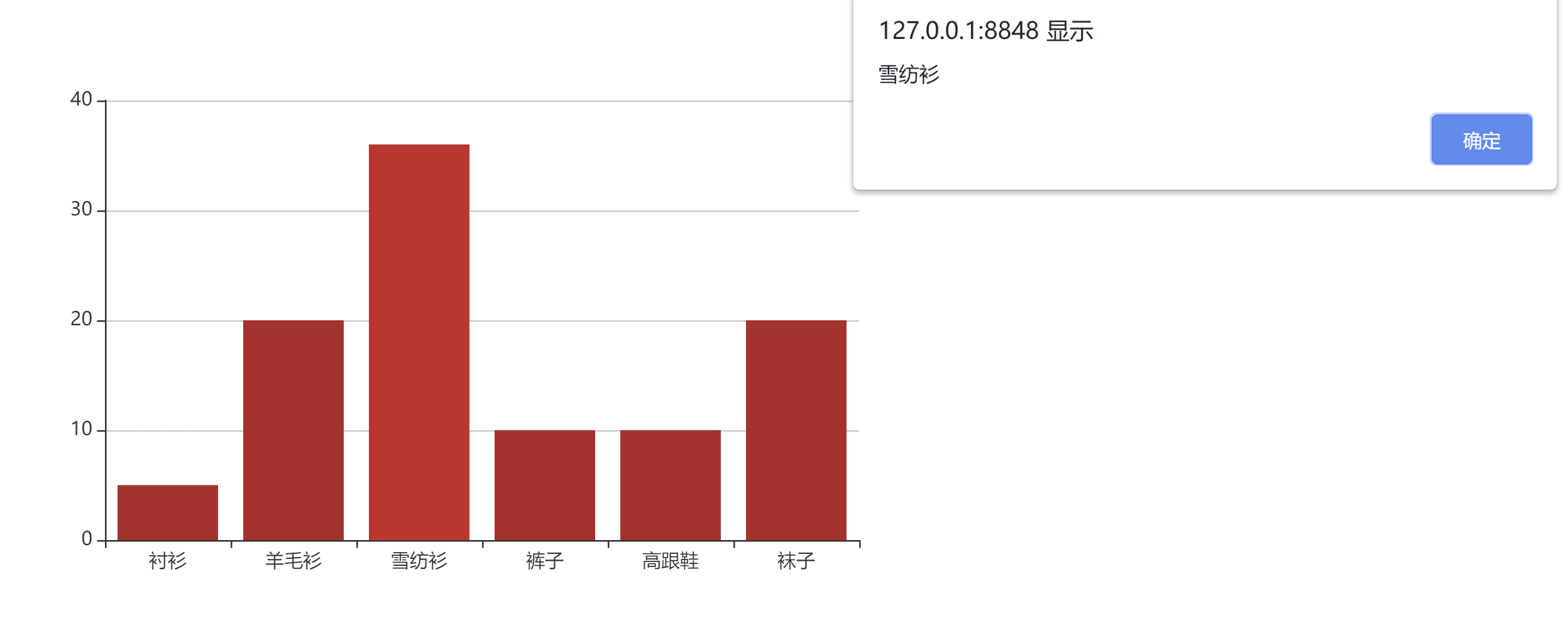 <body><!-- 为ECharts准备一个具备大小(宽高)的Dom --><div id="main" style="width: 600px;height:400px;"></div><script type="text/javascript">// 基于准备好的dom,初始化ECharts实例var myChart = echarts.init(document.getElementById('main'));// 指定图表的配置项和数据var option = {xAxis: {data: ["衬衫","羊毛衫","雪纺衫","裤子","高跟鞋","袜子"]},yAxis: {},series: [{name: '销量',type: 'bar',data: [5, 20, 36, 10, 10, 20]}]};// 使用刚指定的配置项和数据显示图表。myChart.setOption(option);// 处理点击事件并且弹出数据名称myChart.on('click', function (params) {alert(params.name);});</script>