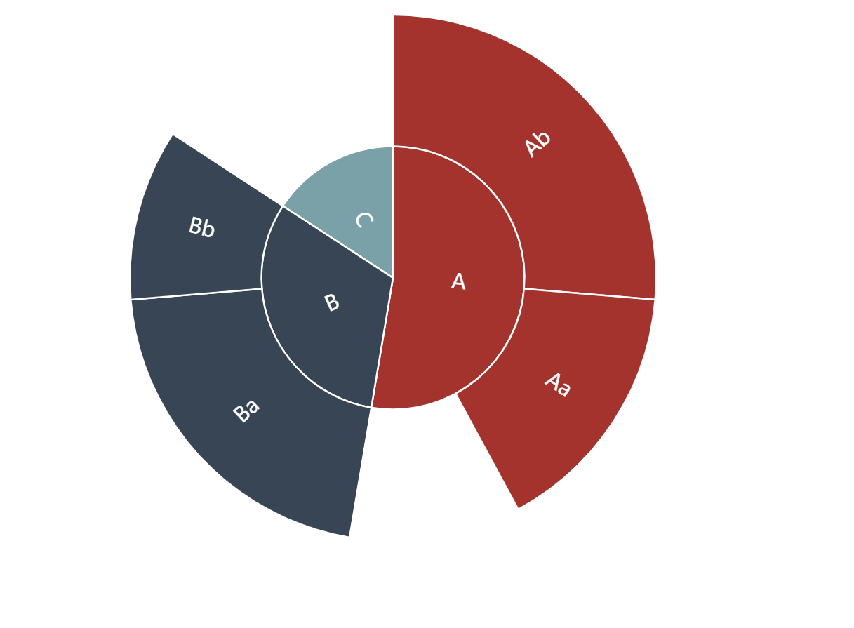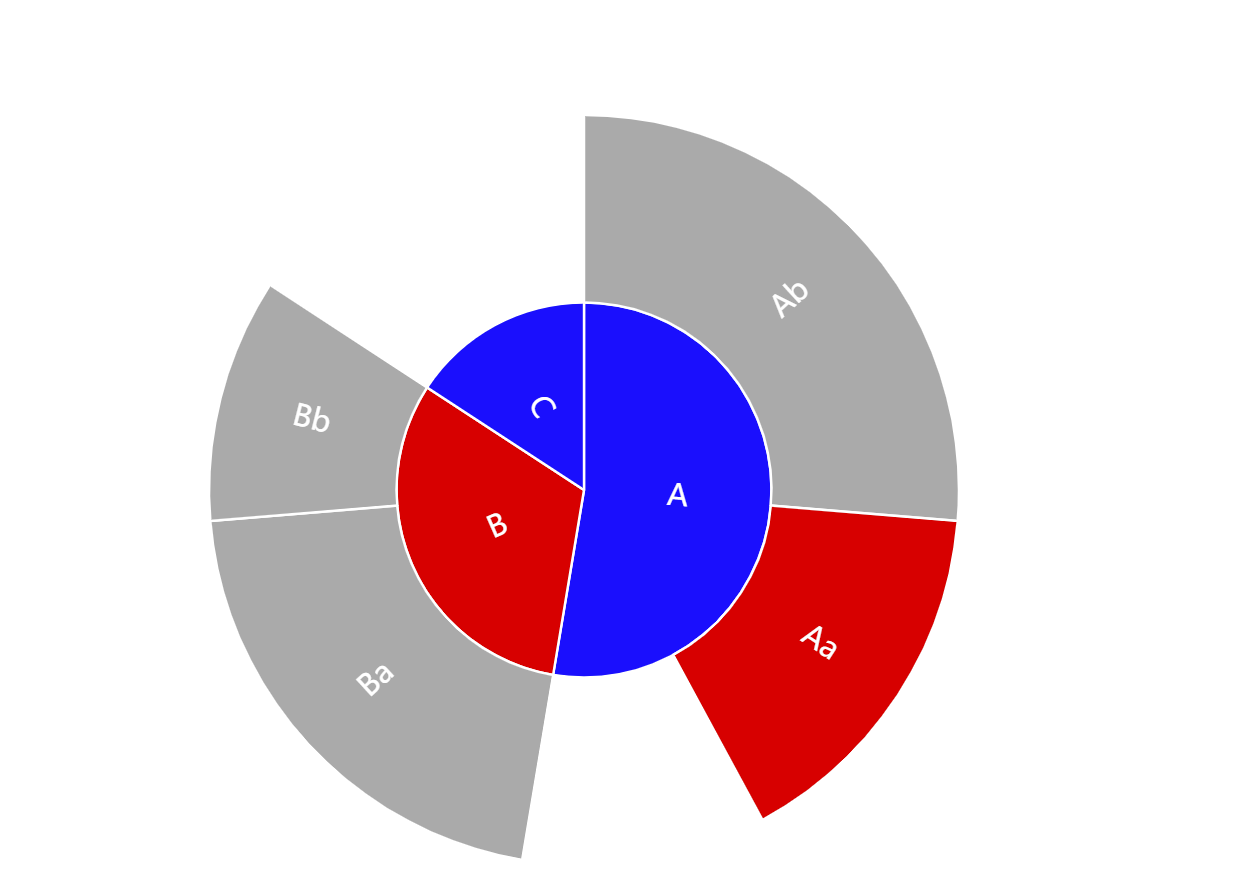 <body><!-- 为ECharts准备一个具备大小(宽高)的Dom --><div id="main" style="width: 600px;height:400px;"></div><script type="text/javascript">// 基于准备好的dom,初始化echarts实例var myChart = echarts.init(document.getElementById('main'));// 指定图表的配置项和数据var option = {series: {type: 'sunburst',data: [{name: 'A',value: 10,children: [{value: 3,name: 'Aa',itemStyle: {color: 'red'}}, {value: 5,name: 'Ab'}]}, {name: 'B',children: [{name: 'Ba',value: 4}, {name: 'Bb',value: 2}],itemStyle: {color: 'red'}}, {name: 'C',value: 3}],itemStyle: {color: '#aaa'},levels: [{// 留给数据下钻的节点属性}, {itemStyle: {color: 'blue'}}]}};// 使用刚指定的配置项和数据显示图表。myChart.setOption(option);</script>