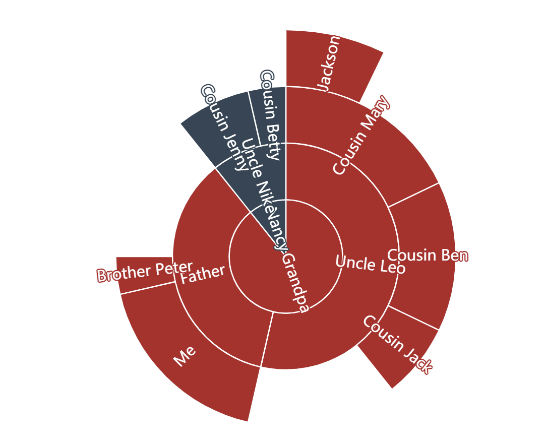 <body><!-- 为ECharts准备一个具备大小(宽高)的Dom --><div id="main" style="width: 600px;height:400px;"></div><script type="text/javascript">// 基于准备好的dom,初始化echarts实例var myChart = echarts.init(document.getElementById('main'));var data = [{name: 'Grandpa',children: [{name: 'Uncle Leo',value: 15,children: [{name: 'Cousin Jack',value: 2}, {name: 'Cousin Mary',value: 5,children: [{name: 'Jackson',value: 2}]}, {name: 'Cousin Ben',value: 4}]}, {name: 'Father',value: 10,children: [{name: 'Me',value: 5}, {name: 'Brother Peter',value: 1}]}]}, {name: 'Nancy',children: [{name: 'Uncle Nike',children: [{name: 'Cousin Betty',value: 1}, {name: 'Cousin Jenny',value: 2}]}]}];option = {series: {type: 'sunburst',// highlightPolicy: 'ancestor',data: data,radius: [0, '90%'],label: {rotate: 'radial'}}};// 使用刚指定的配置项和数据显示图表。myChart.setOption(option);</script>