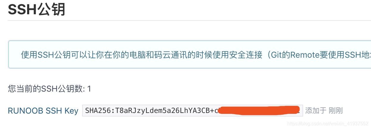 我们在 Git Github 章节已经生成了自己的 SSH 公钥,所以我们只需要将用户主目录下的 ~/.ssh/id_rsa.pub 文件的内容粘贴 Gitee 上。