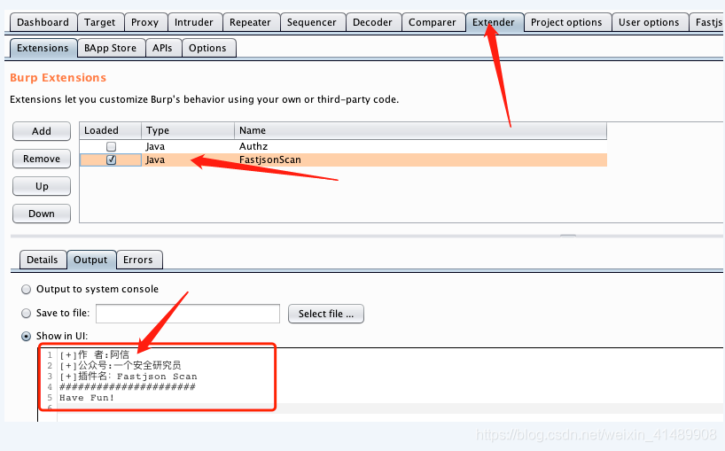 1、下载项目中的FastjsonScan.jar文件,在burp的Extender->Extensions栏,点击Add,选择下载好的jar文件就可以了(执行环境是Java)