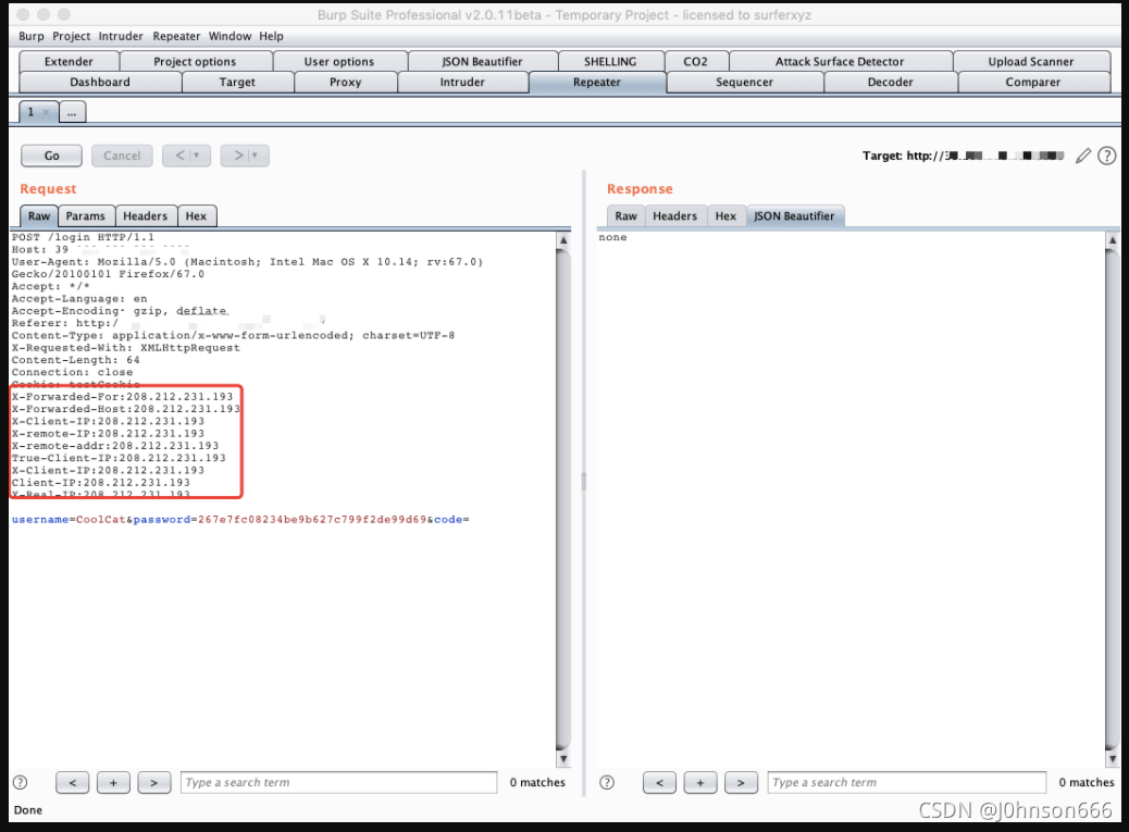 在Repeater模块右键选择fakeIp菜单,然后点击randomIP功能:
