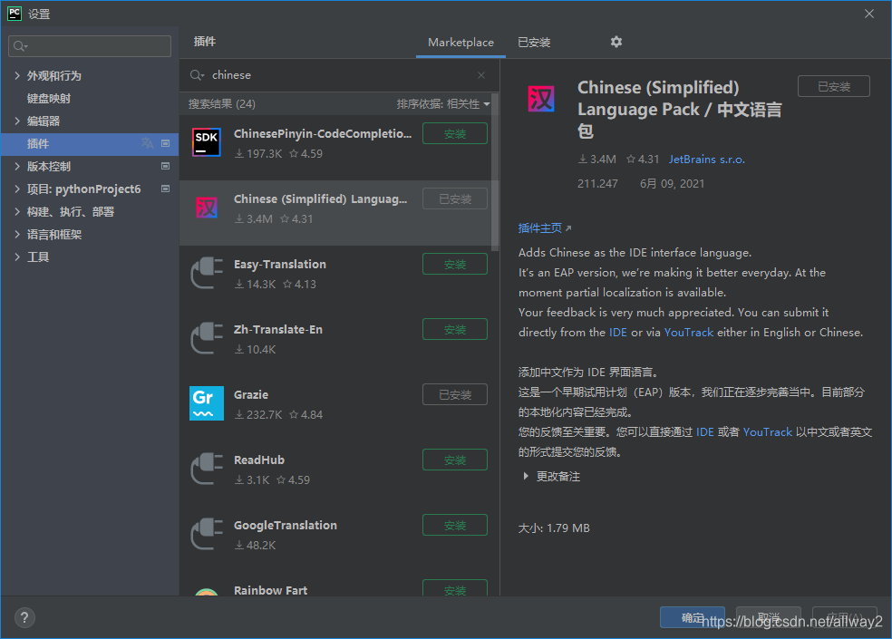 在搜索结果中,选中Chinese(Simplified) Language Pack,点击右边的“install”即可。