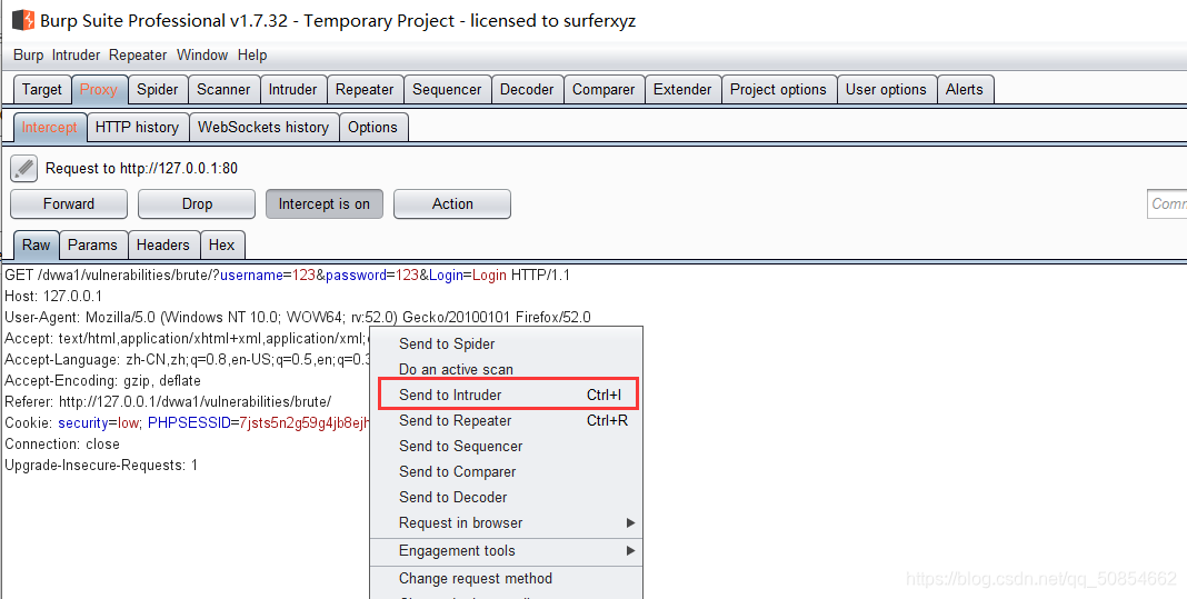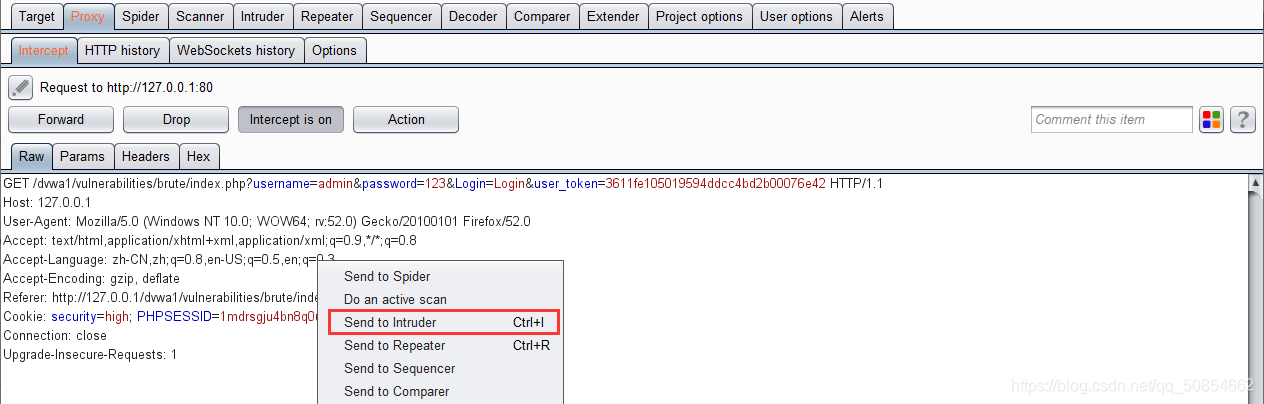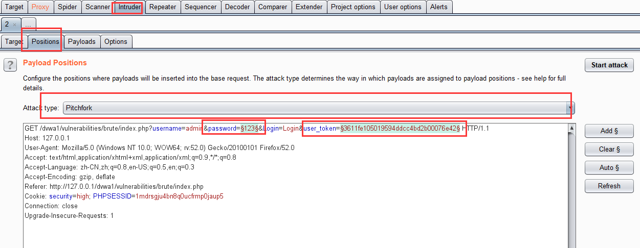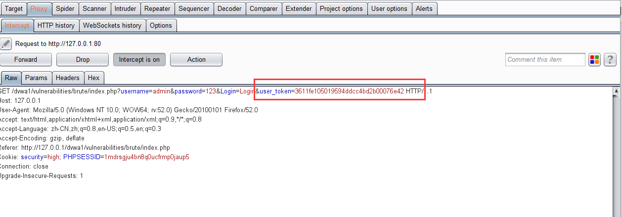 High级别的代码加入了Token,可以抵御CSRF攻击,同时也增加了爆破的难度,通过抓包,可以看到,登录验证时提交了四个参数:username、password、Login以及user_token。