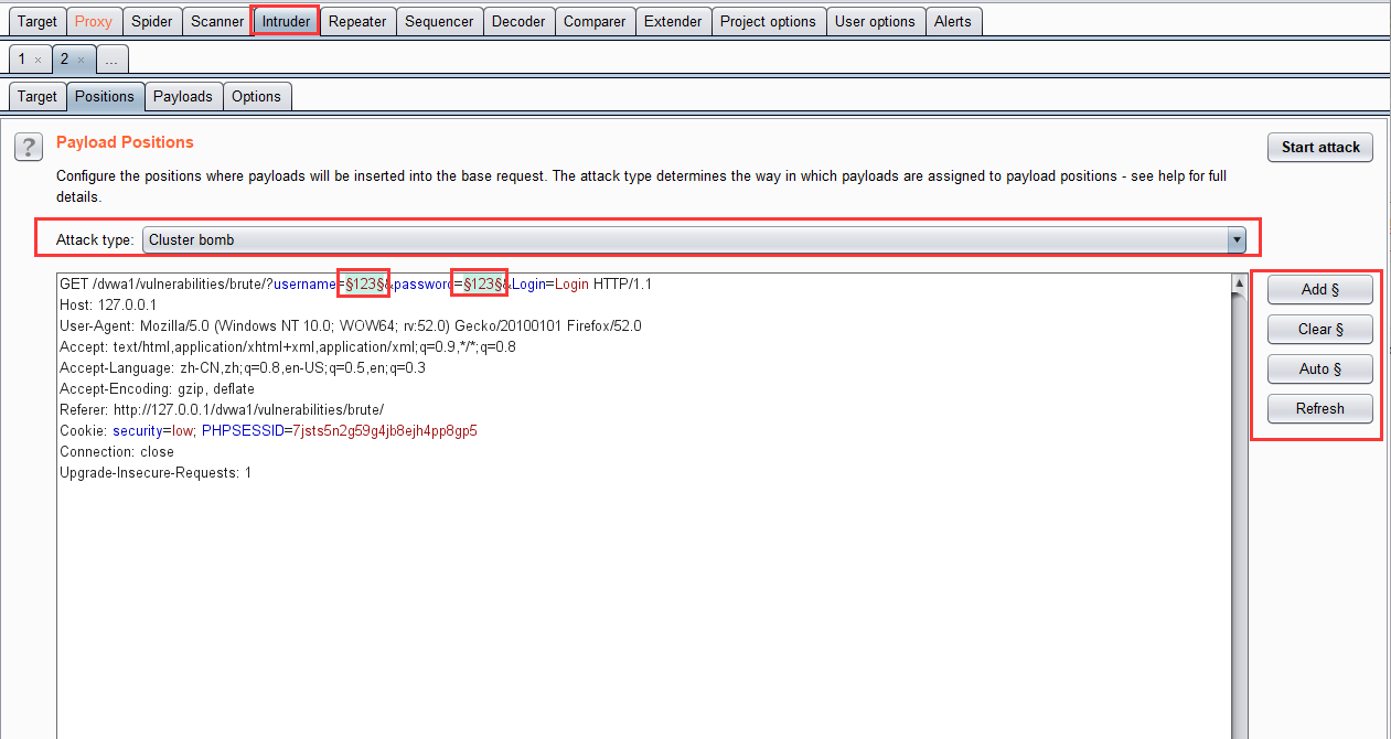 send to intruder在intruder的positions选择中,先点击clear$清除所有的变量。然后分别给username和password这两个字段后面的内容添加add$,添加变量并将attack type的值设置为cluster bomb
