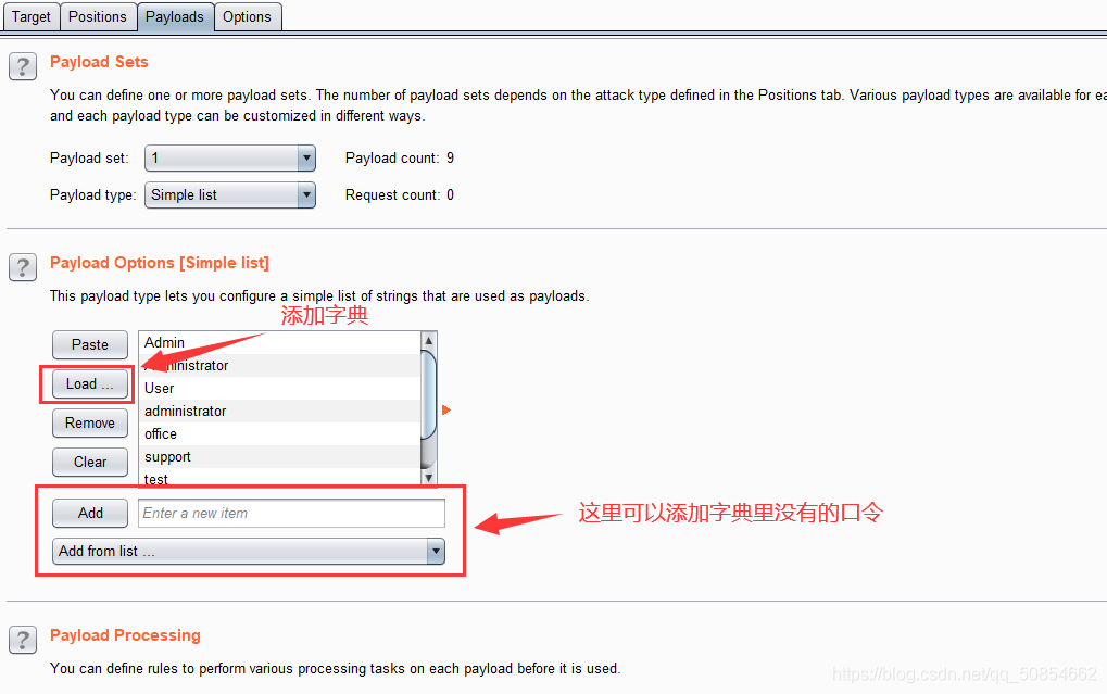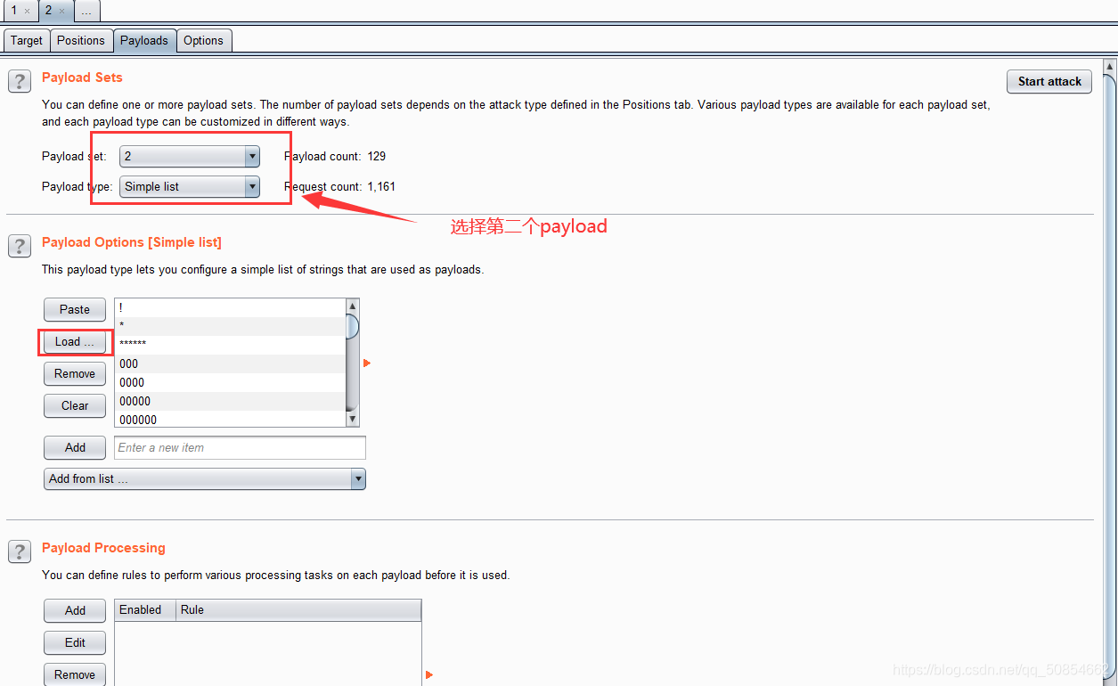 在payloads选择中分别给payload 1和payload 2设置字典路径。