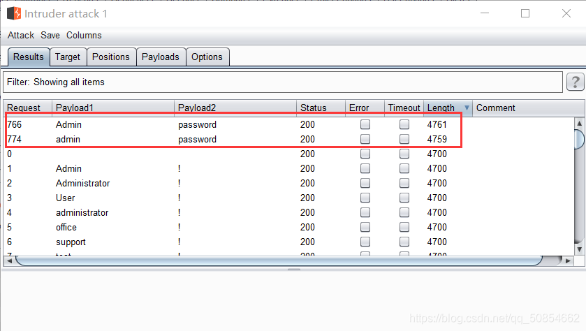 红色部分为破解的密码通过上面的破解,我们发现length的长度存在不一样,不一样的就是为破解成功的账号和密码。