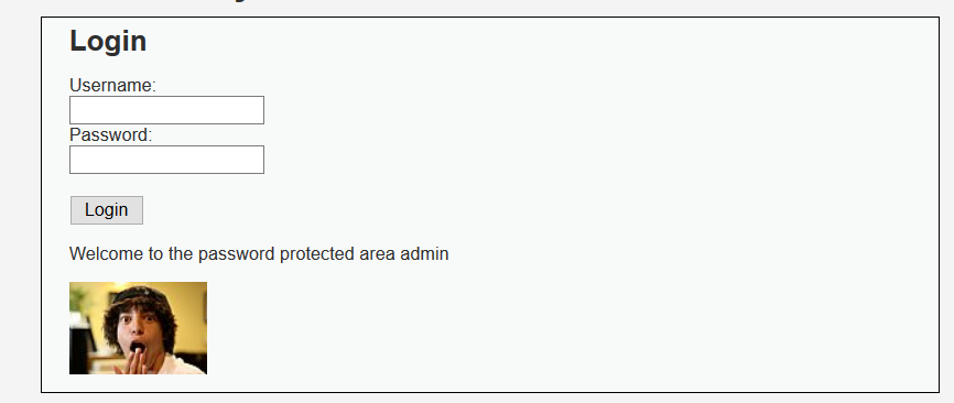 <?phpif( isset( $_GET[ 'Login' ] ) ) {// Get username$user = $_GET[ 'username' ];// Get password$pass = $_GET[ 'password' ];$pass = md5( $pass );// Check the database$query = "SELECT * FROM `users` WHERE user = '$user' AND password = '$pass';";$result = mysqli_query($GLOBALS["___mysqli_ston"], $query ) or die( '<pre>' . ((is_object($GLOBALS["___mysqli_ston"])) ? mysqli_error($GLOBALS["___mysqli_ston"]) : (($___mysqli_res = mysqli_connect_error()) ? $___mysqli_res : false)) . '</pre>' );if( $result && mysqli_num_rows( $result ) == 1 ) {// Get users details$row = mysqli_fetch_assoc( $result );$avatar = $row["avatar"];// Login successfulecho "<p>Welcome to the password protected area {$user}</p>";echo "<img src=\"{$avatar}\" />";}else {// Login failedecho "<pre><br />Username and/or password incorrect.</pre>";}((is_null($___mysqli_res = mysqli_close($GLOBALS["___mysqli_ston"]))) ? false : $___mysqli_res);