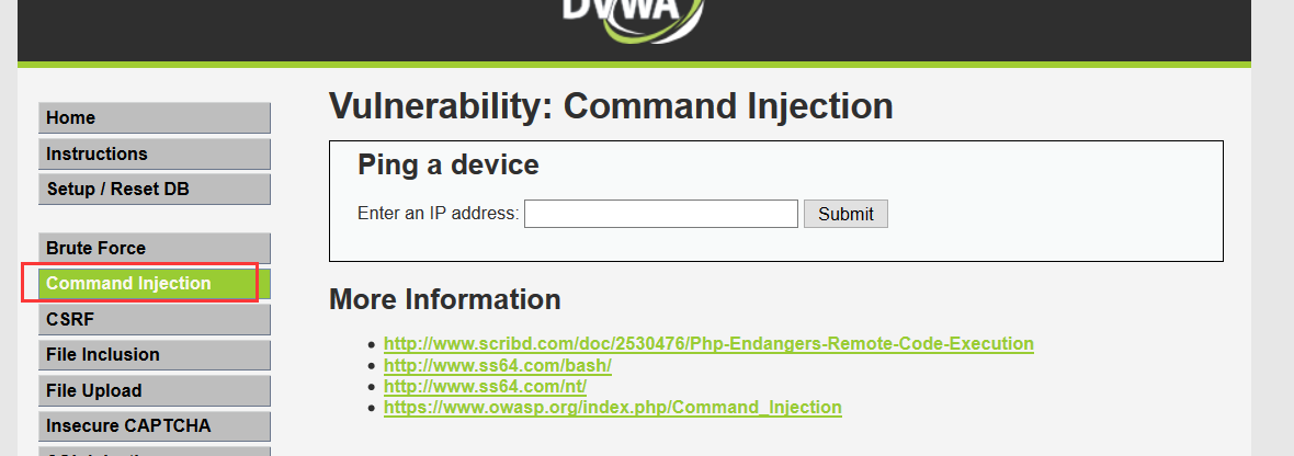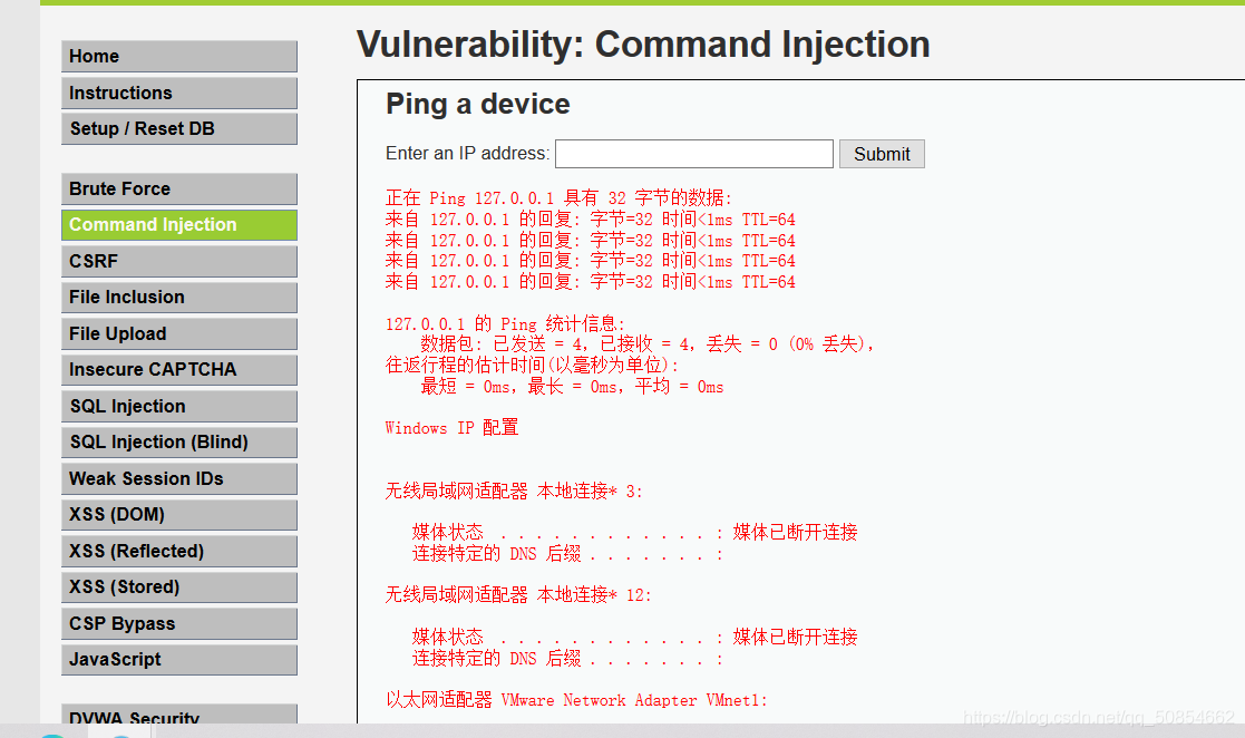 <?phpif( isset( $_POST[ 'Submit' ] ) ) {// Get input$target = $_REQUEST[ 'ip' ];// Determine OS and execute the ping command.if( stristr( php_uname( 's' ), 'Windows NT' ) ) {// Windows$cmd = shell_exec( 'ping ' . $target );}else {// *nix$cmd = shell_exec( 'ping -c 4 ' . $target );}// Feedback for the end userecho "<pre>{$cmd}</pre>";