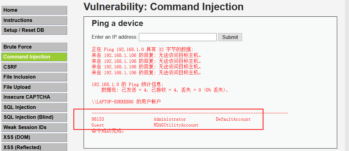 在文本框里输入”192.168.0.1 && net user”,得到以下系统中所有的用户