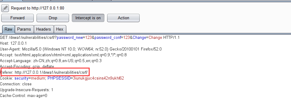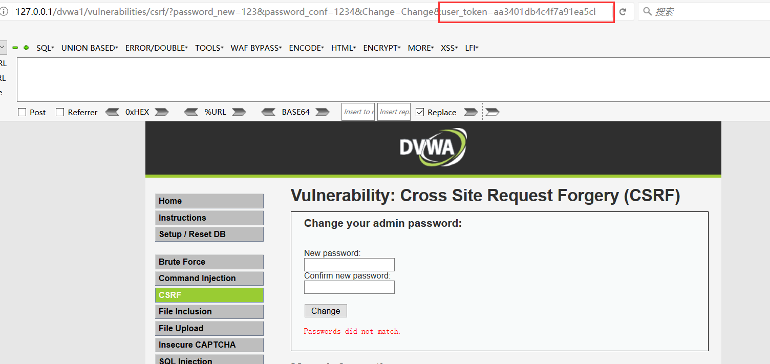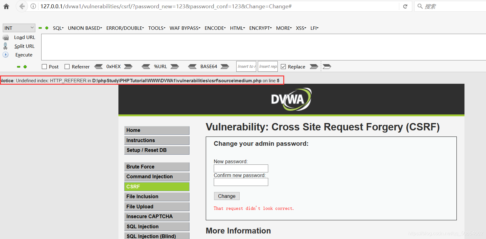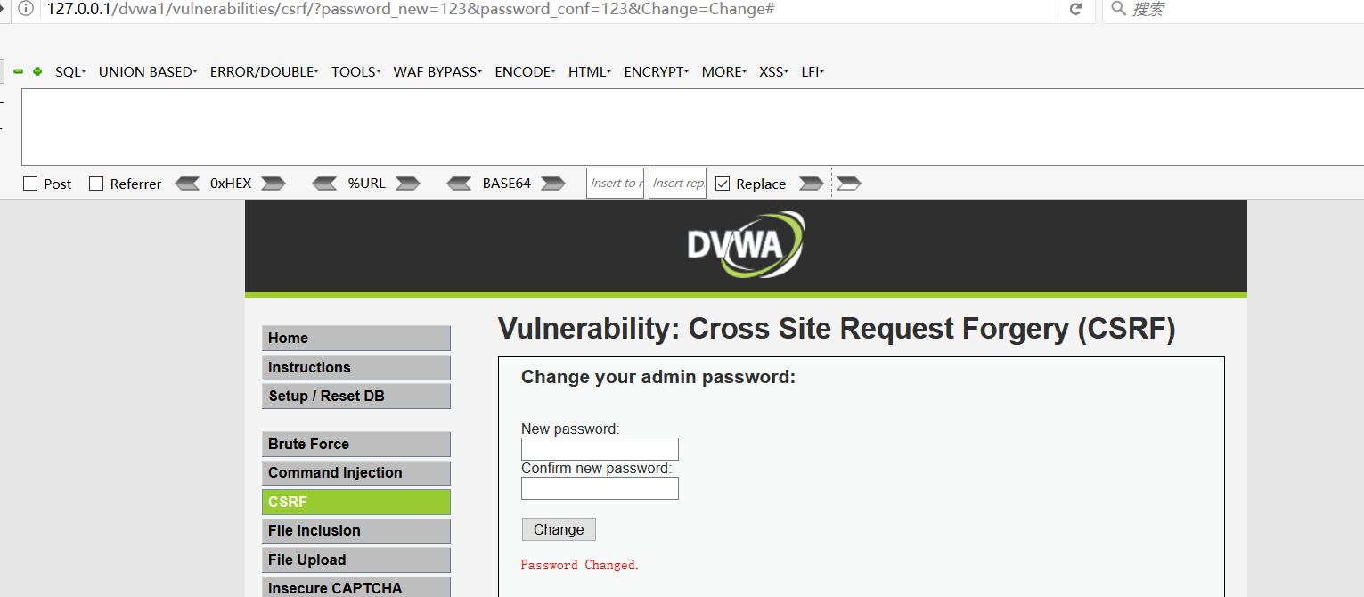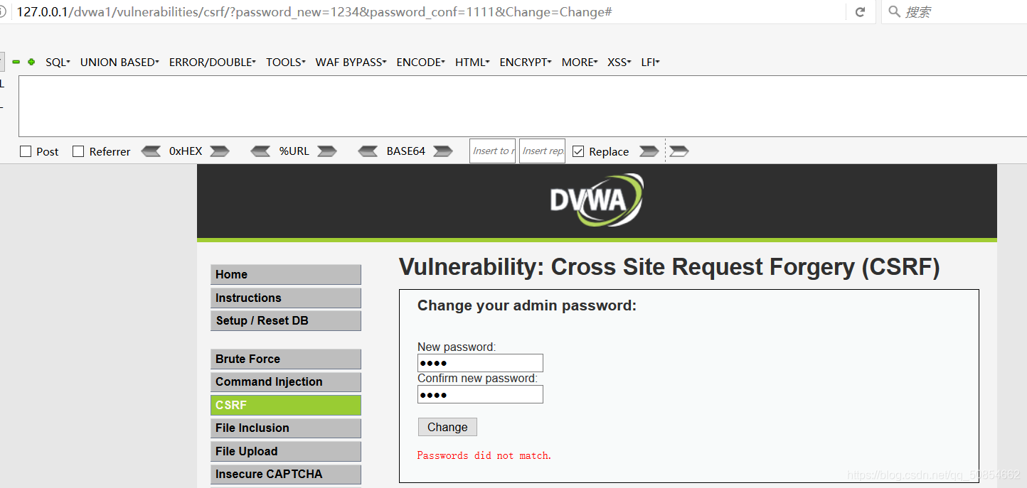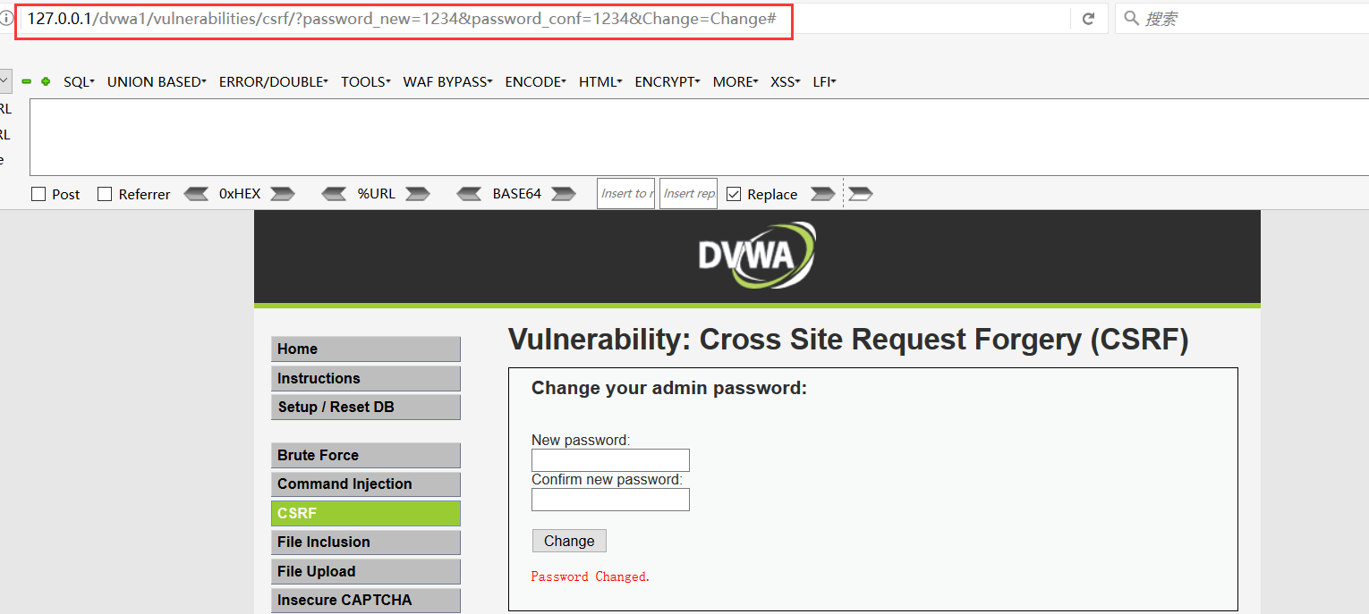 可以看到顶部的URL是:http://127.0.0.1/dvwa1/vulnerabilities/csrf/?password_new=1234&password_conf=1111&Change=Change#