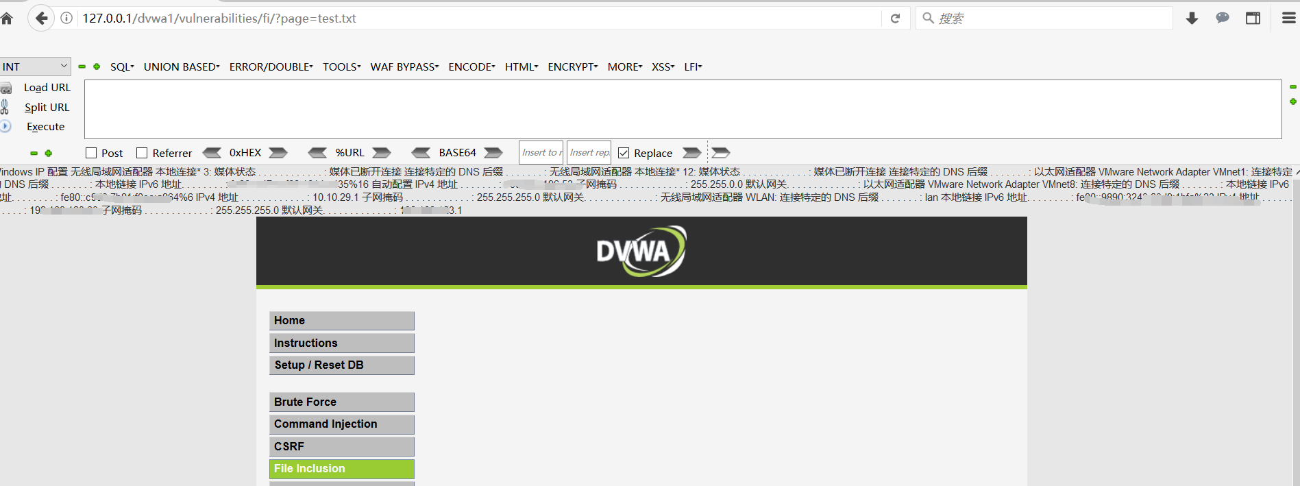 我们在D:\phpStudy\PHPTutorial\WWW\DVWA1\vulnerabilities\fi目录中创建一个测试文件test.txt,文件内容是“<?php system('ipconfig');?>”,通过文件包含漏洞可以直接查看到该文件内容。