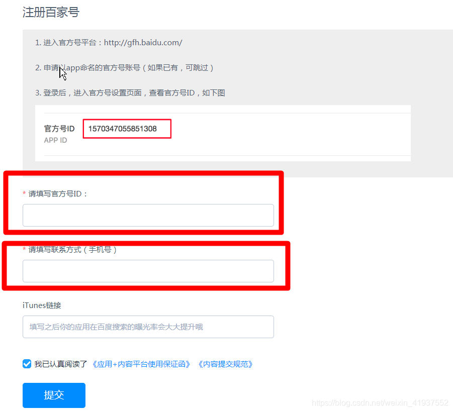 填写官方的ID以及联系人的手机号即可,最后点击提交。