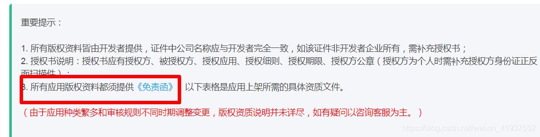 我的应用被打回来啦,说明这个免责函需要要填写。今天公章还不在公司,还着急上线,不能准时上线就扣20%的工资。