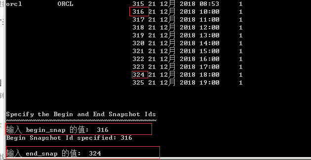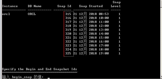 5.输入开始 snap id 与结束 snap id(最好输入系统运行缓慢时间段内的数值如: 315 -318)