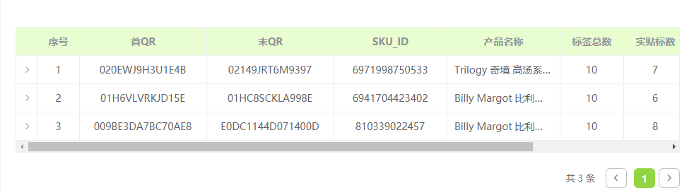 export default {components: {myTable},data() {return {searchForm:{ //请求参数endTime:"2021-07-15",startTime:"2020-07-01",pageNum:1,pageSize:10},total: 0, //页码需要的参数tableData: [], //后台传过来的数据tableInfo: [{key: "firstLabelQr", value: "首QR", "minWidth": 180},{key: "lastLabelQr", value: "末QR", "minWidth": 180},{key: "skuId", value: "SKU_ID", "minWidth": 160},{key: "skuName", value: "产品名称", "minWidth": 160},{key: "totalNum", value: "标签总数", "minWidth": 90},{key: "realNum", value: "实贴标数", "minWidth": 90},{key: "voidNum", value: "废标数", "minWidth": 90},{key: "activeTime", value: "上传时间", "minWidth": 150}]}},methods: {initData(pageNum){ //参数用于table组件,父级页面使用该函数时不需要传参this.searchForm.pageNum = pageNum ? pageNum : 1; //这行语句必填。this.$axios.post(this.$api.listQrIntegral, this.searchForm).then( res =>{this.tableData = res.datas.records;this.total = res.datas.total;})}},created(){this.initData();}