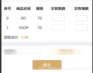 <!-- 表格数据--> <view class="real_detail gray_line"><view class="tr"><view class="th">序号</view><view class="th">商品名称</view><view class="th">规格</view><view class="th">实收瓶数</view><view class="th">实收箱数</view></view><!-- 表格输入框数据。--><!-- data-shopname最好传后台需要的每条数据的标识,这里我用的商品名称做标识 --><!-- data-input是用来判断点击的输入框是属于实收瓶数的,还是实收箱数的 --><view class="tr" wx:for="{{list}}" wx:key="index" ><view class="td">{{index+1}}</view><view class="td over" data-text="{{item.collectionSkuClassName}}" bindtap="showText">{{item.collectionSkuClassName}}</view><view class="td">{{item.size/10}}</view><view class="td"><input class="num_input" type="number" data-collectionSkuId="{{item.collectionSkuId}}" data-input="实收瓶数" data-index="{{index}}" bindinput="getReallNum"/></view><view class="td"><input class="num_input" type="number" data-collectionSkuId="{{item.collectionSkuId}}" data-input="实收箱数" data-index="{{index}}" bindinput="getReallNum"/></view></view></view><!-- 验证码&提交 --><view class="submit_view"><view class="submit_btn_view"><button class="submit_btn" bindtap="submit">提交</button></view></view>