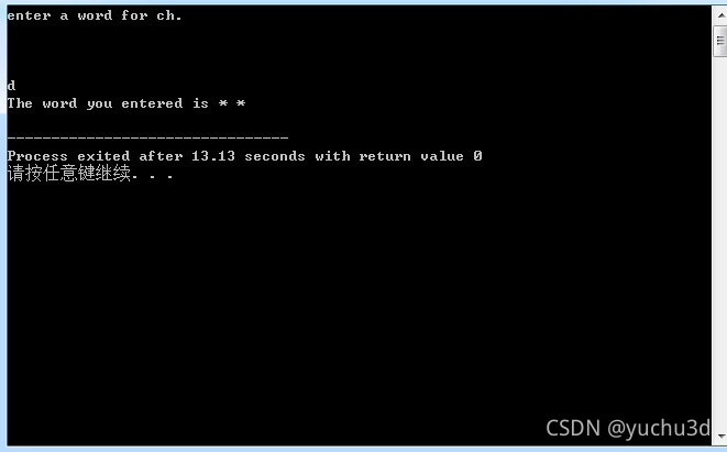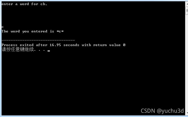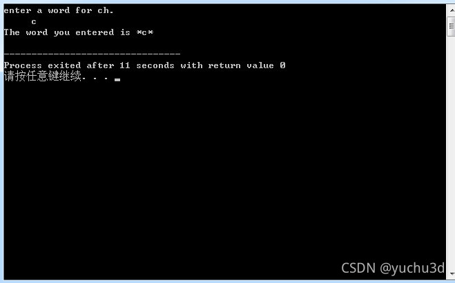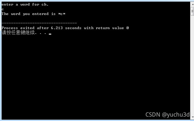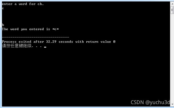 例如,我们首先输入字符c,程序并未进入下一步,还在等待输入,我们输入多个空格和回车,依旧如此,当输入字符b之后,进入下一步,运行结果scanf()读取的是第一次输入的c.