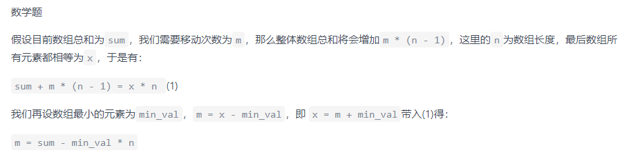 class Solution {public int minMoves(int[] nums) {int res = 0;int sum = 0;int n = nums.length;for(int i = 0;i<n;i++){sum += nums[i];}res = sum - minVal(nums) * n;return res;}public int minVal(int[] nums){int ans = Integer.MAX_VALUE;for(int i : nums){ans = ans>i?i:ans;}return ans;}