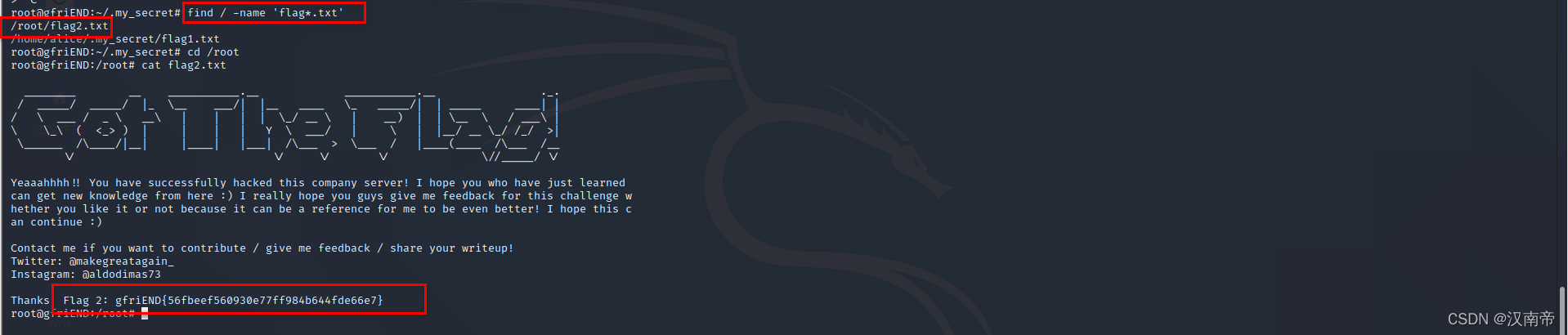 提权后,查找flage的文件使用命令 find / -name 'flag*.txt',查看flag2.txt文件发现了flag