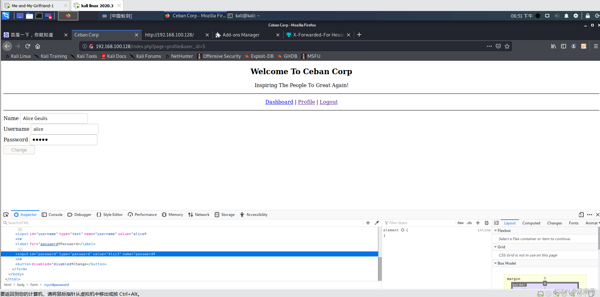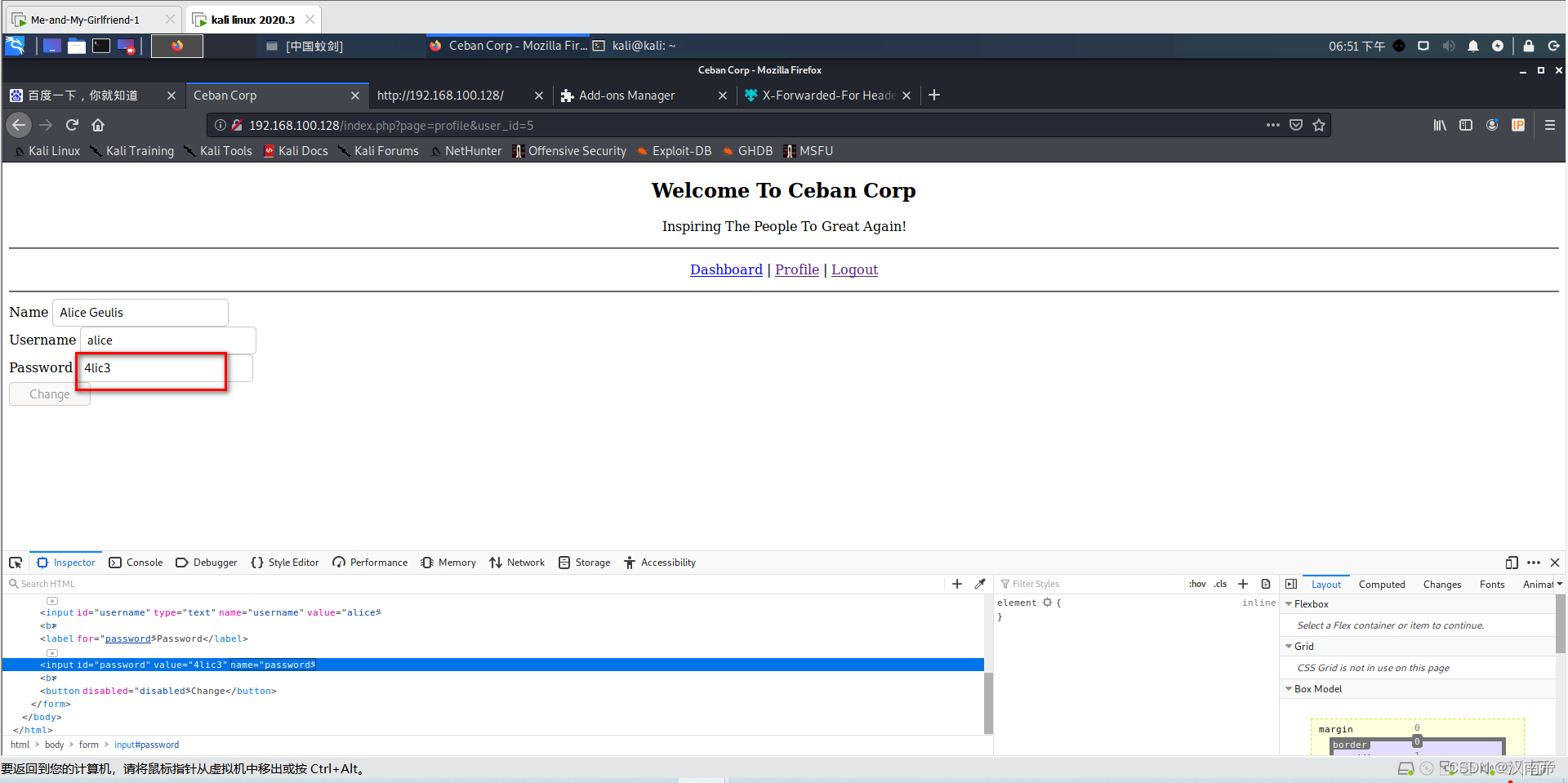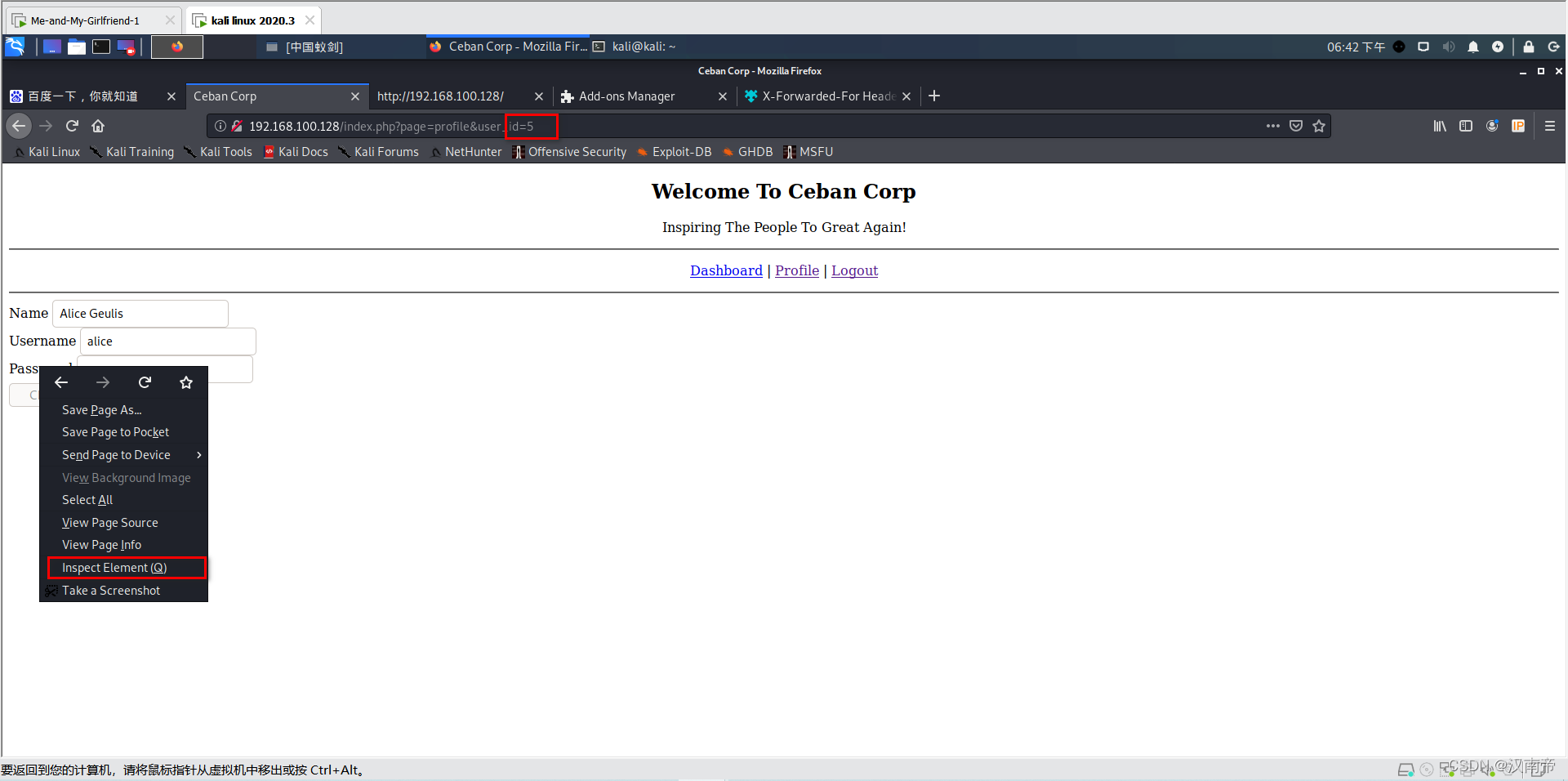 成功登录该网站发现http://192.168.100.128/index.php?page=profile&user_id=5,id后面改动数字后用户随之改变,利用这一点,尝试登录alice的账号