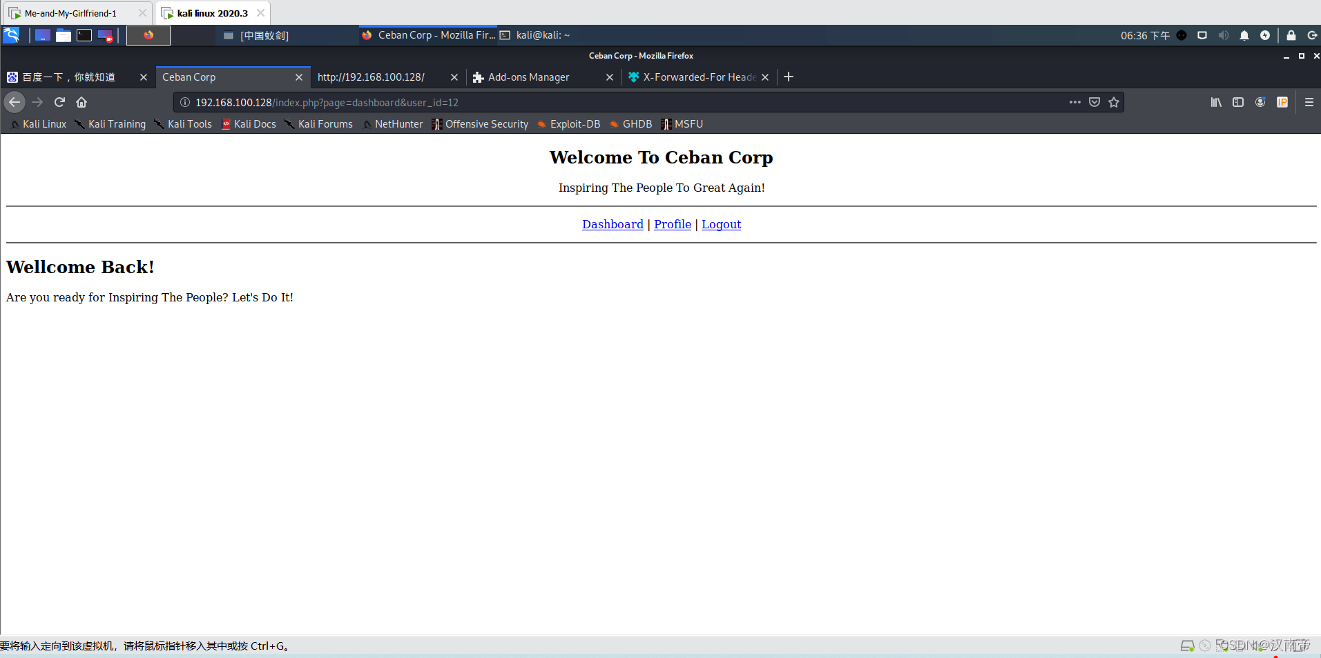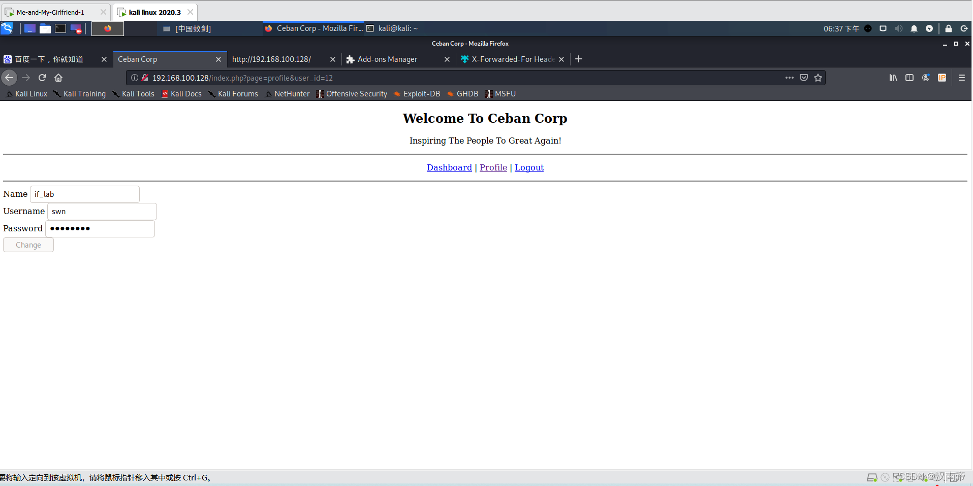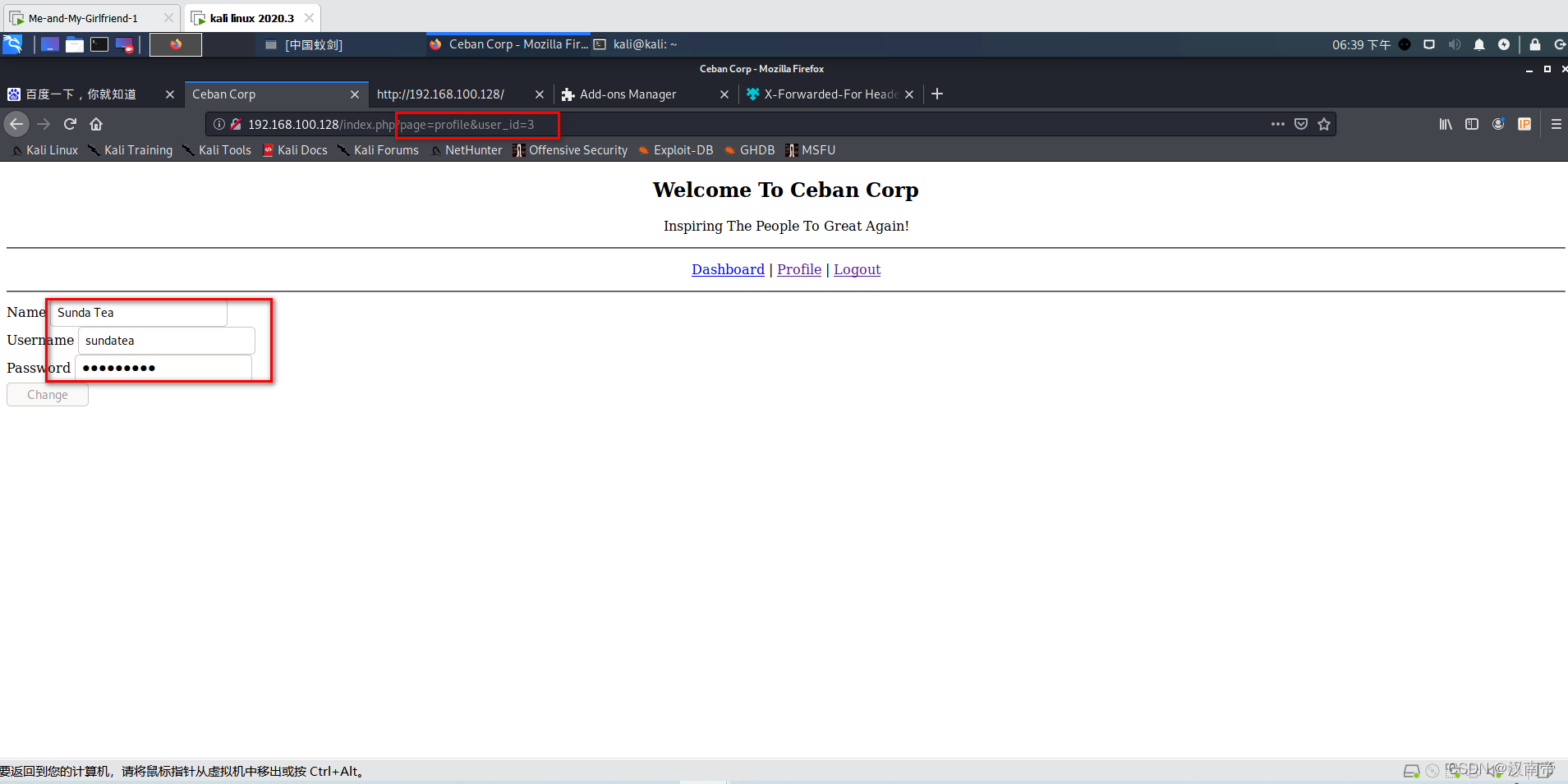 成功登录该网站发现http://192.168.100.128/index.php?page=profile&user_id=5,id后面改动数字后用户随之改变,利用这一点,尝试登录alice的账号