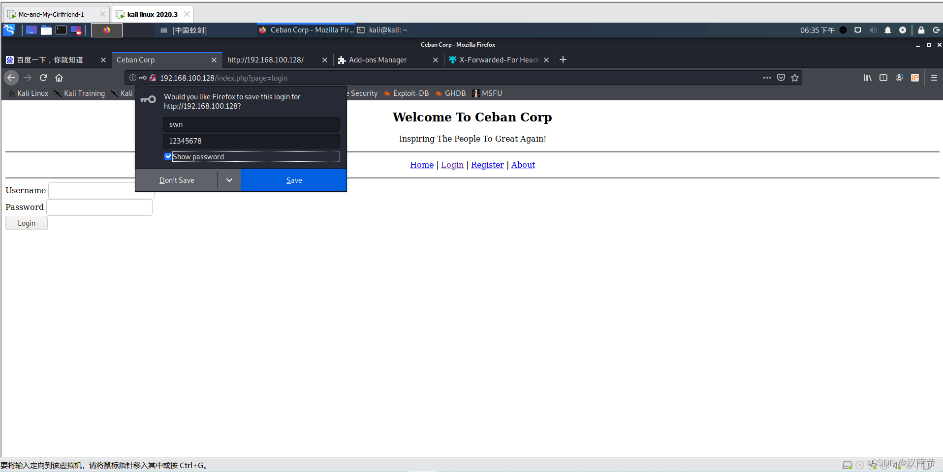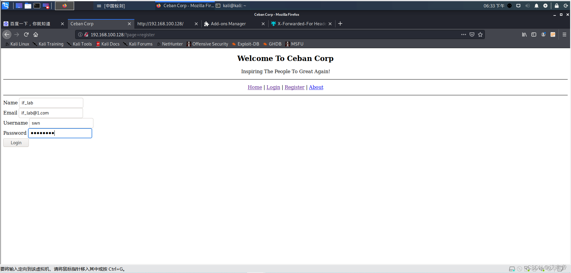 配置好之后,刷新192.168.100.128这个页面,进入到了这个靶机的网站,随便注册一个账号尝试登录这个网站