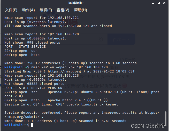 用 nmap -sV -n -open -p- 192.168.100.128 扫出靶机详细信息
