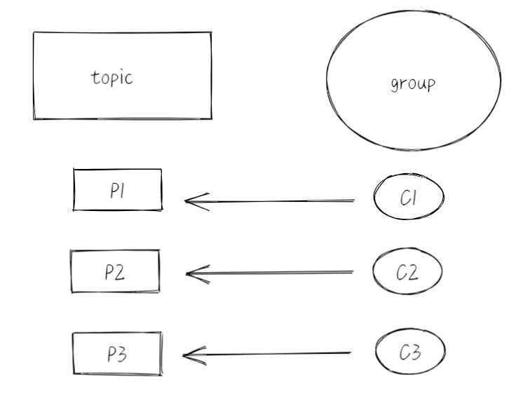 假设组里面有3个消费者,topic将C1 C2 C3其分区到P1 P2 P3中,进行对应消费