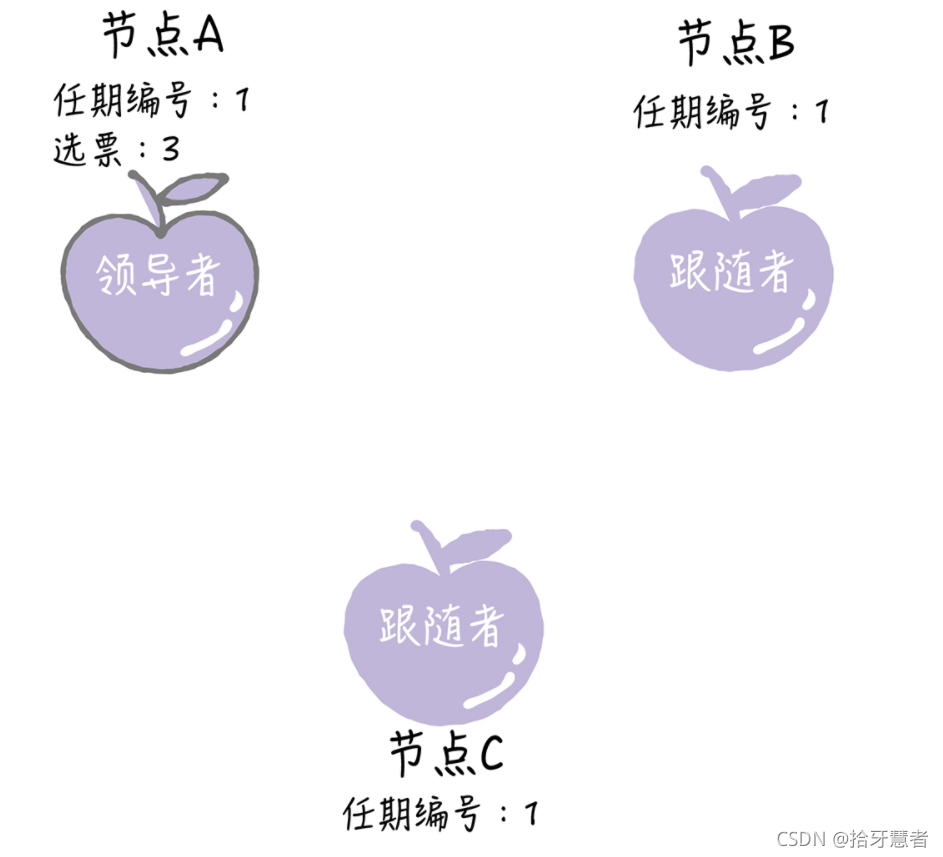 服务器节点状态一共有三种:领导者(Leader)、跟随着(Follower)、候选人(Candidate)
