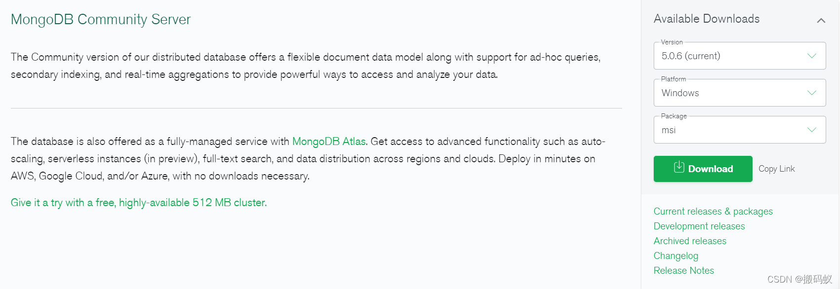 你可以在mongodb官网下载该安装包,地址为:Try MongoDB Atlas Products | MongoDB。MonggoDB支持以下平台:
