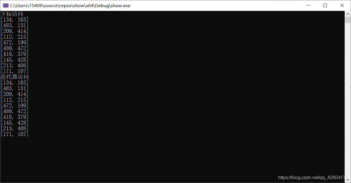 {std::vector<cv::Point> points(10,Point(10,10));if (points.empty()){cout << "points is empty" << endl;}cout << "size " << points.size() << endl;//使用vector 操作集中的begin()和 end()所返回的迭代器 iterator cout << "迭代器访问" << endl;for (vector<Point>::iterator it = points.begin();it != points.end(); ++it){cout << *it << endl;}return 0;