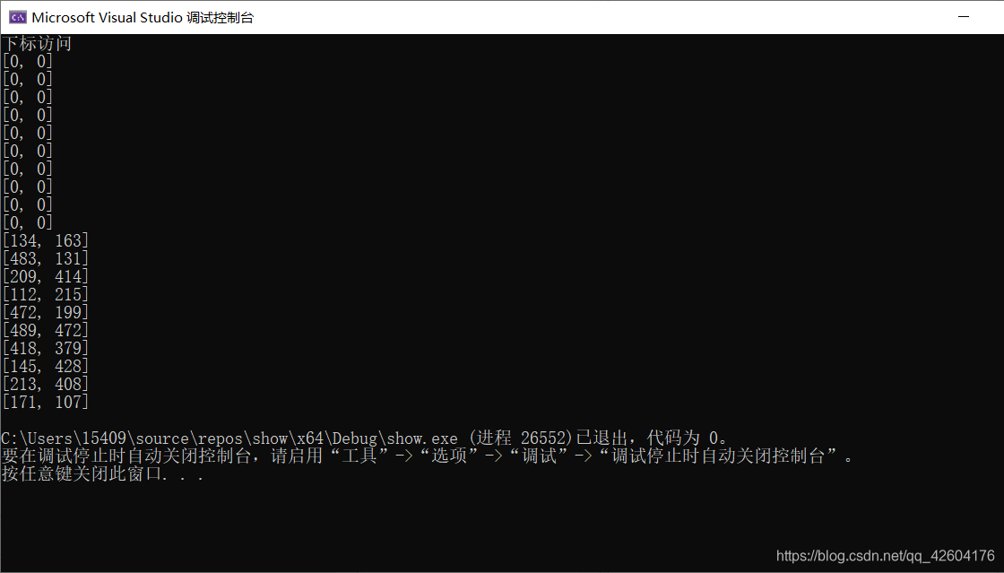 Mat img(500, 500, CV_8UC3, Scalar(0, 0, 0));std::vector<cv::Point> points(10);//随机初始化10个点for (int i = 0;i < 10;i++){float x = rng.uniform(0, img.cols);float y = rng.uniform(0, img.rows);points.push_back(cv::Point(x, y));//显示circle(img, points[i], 2, Scalar(0, 0, 255), FILLED, LINE_AA);}//【访问元素】//1、下标访问cout << "下标访问"<< endl;for (int i = 0;i < points.size();i++){cout << points[i] << endl;}