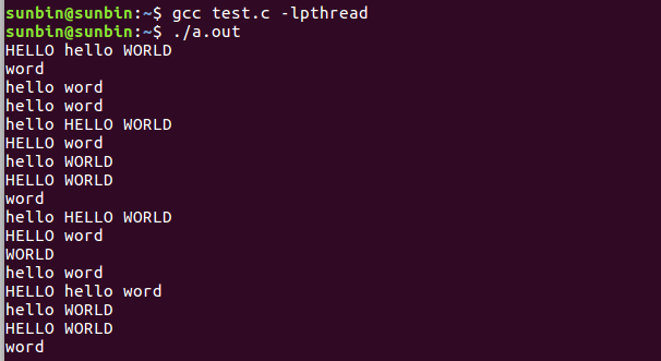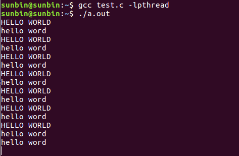 {pthread_t tid;srand(time(NULL));pthread_create(&tid, NULL, tfn, NULL);while(1) {printf("HELLO ");sleep(rand() % 3);printf("WORLD\n");sleep(rand() % 3);}return 0;