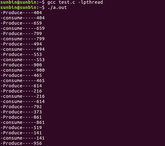 {pthread_t pid, cid;srand(time(NULL));pthread_create(&pid, NULL, producer, NULL);pthread_create(&cid, NULL, consumer, NULL);pthread_join(pid, NULL);pthread_join(cid, NULL);return 0;