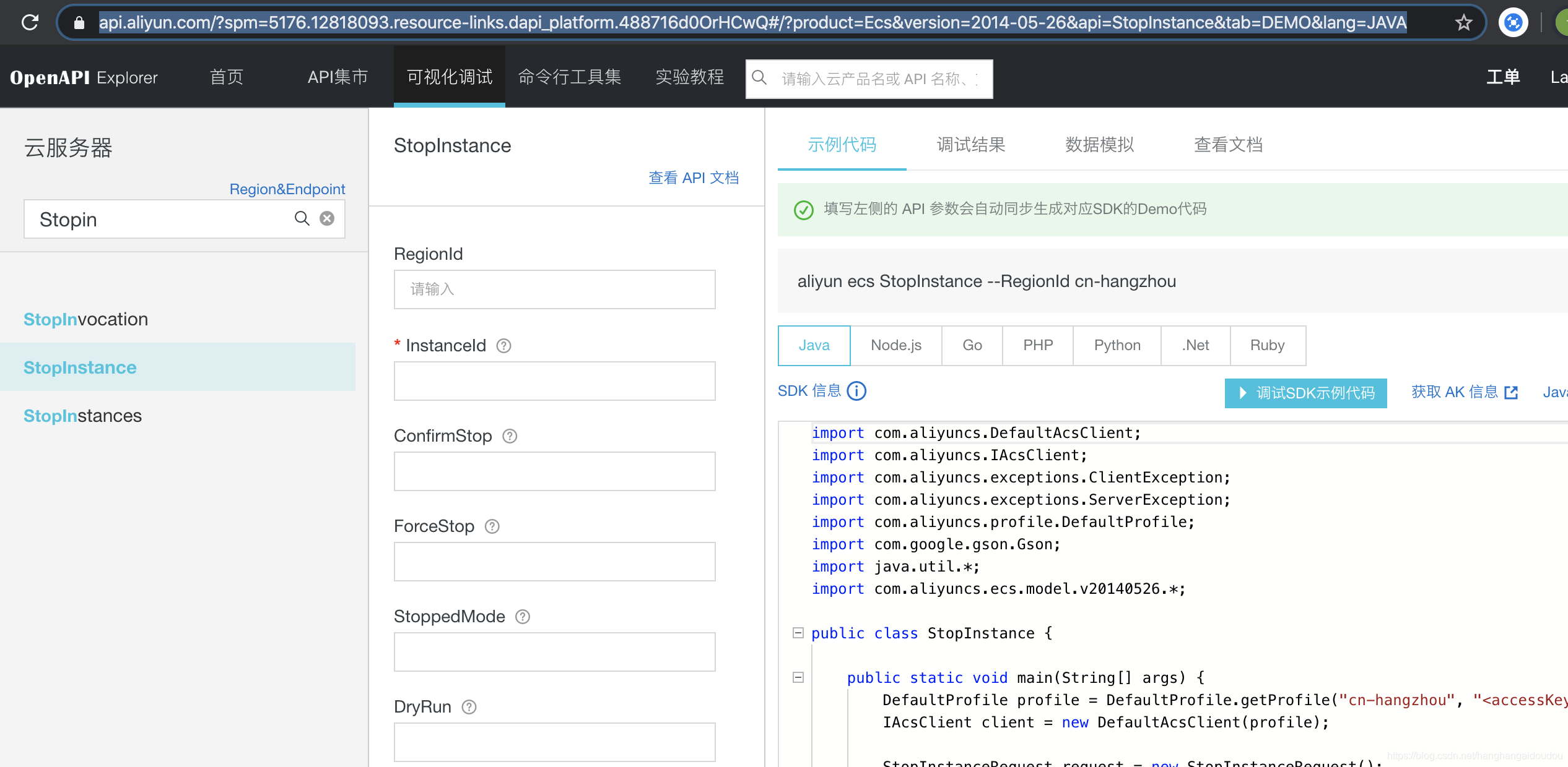 URL:https://api.aliyun.com/?spm=5176.12818093.resource-links.dapi_platform.488716d0OrHCwQ#/?product=Ecs&version=2014-05-26&api=StopInstance&tab=DEMO&lang=JAVA