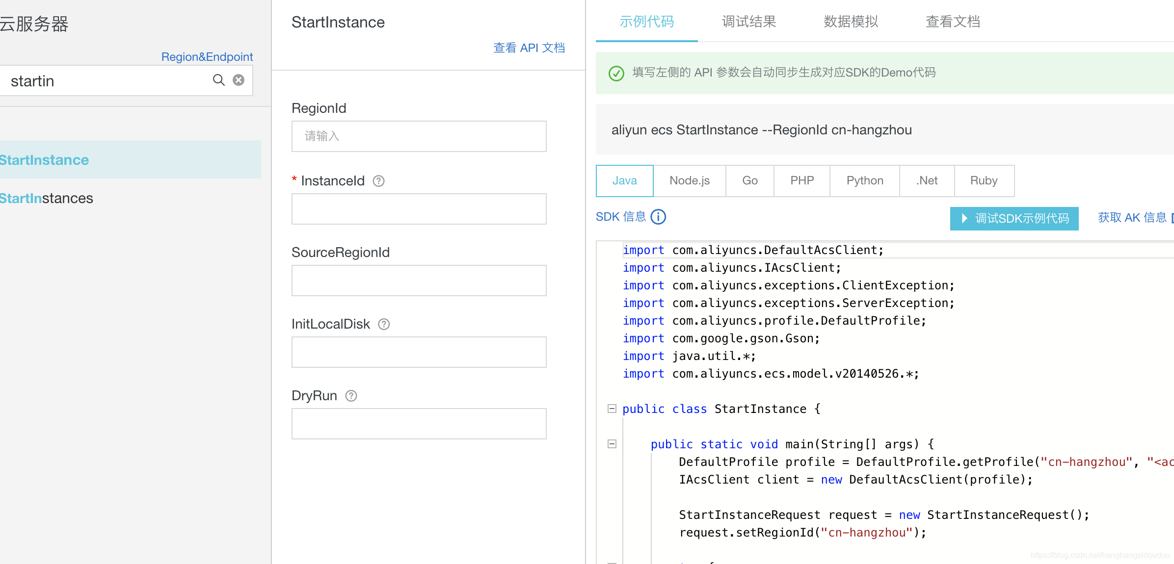 URL:https://api.aliyun.com/?spm=5176.12818093.resource-links.dapi_platform.488716d0OrHCwQ#/?product=Ecs&version=2014-05-26&api=StartInstance&tab=DEMO&lang=JAVA
