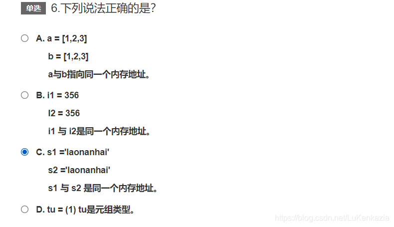 第六题,可以用id()查看是不是同一个内存地址。AB选项是通过分别赋值产生的,生成的分别是列表和整型数据,其在内存开辟了不同的空间,内部指向的是相同的内存地址。C虽然也是分别赋值产生,但是C生成的是字符串,这样使得s1与s2是同一个内存地址。D选项产生的是整形数据,而不是元组。