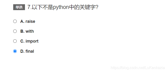 第三题,也是考察模块导入。要只导入模块里具体的类的话是用 from 模块 import 类名 的方式导入,D选项反了。