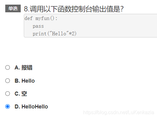 第八题,要注意Python是严格按照缩进分语句块的,这样print("Hello"*2)是属于myfun()函数内部的代码。虽然调用时已经pass了中间部分,但是还是会执行print("Hello"*2)。*号是容器类型表示重复的符号,于是就输出了HelloHello