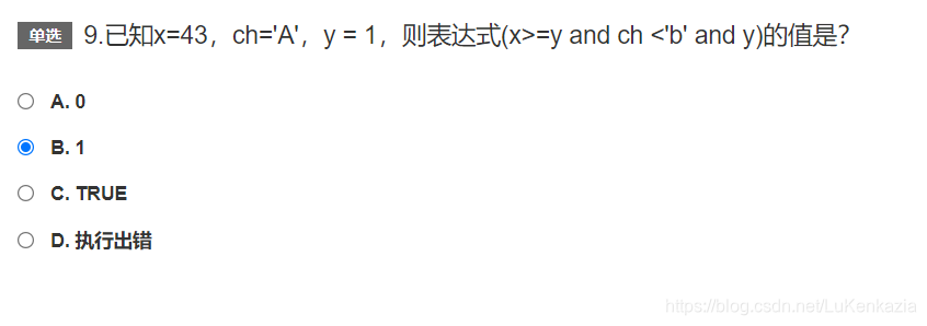 第九题,考察变量和运算符的使用。第一个部分x>=y易知结果为True;而第二部分ch<'b'是字符串的比较,单个字符比较的是其ASCII码值,大写字母的ASCII码值比小写字母的小,于是ch<'b'的结果也是True;第三部分是y,y=1,这样整个运算式就可以表示为True and True and 1。在布尔变量和逻辑运算的学习中可知,当布尔变量参与数字运算时由0代表False,1代表True。True and True and 1运算至下一步变为True and 1,由于数字1在and后面,返回值为数值,于是运算结果为1。